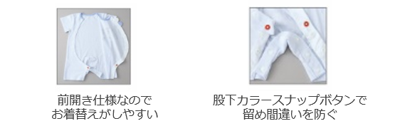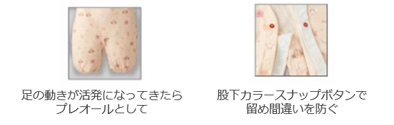 プレオールなので足の動きが活発な赤ちゃんにおすすめ。前開き仕様なので寝ている赤ちゃんのお着替えも簡単にできます。