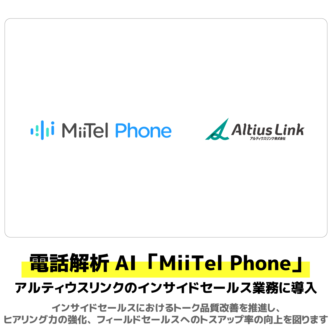 電話解析AI「MiiTel Phone」は、営業やコンタクトセンターにおける活動を可視化し、生産性向上を実現するツールとして多くのお客様にご活用いただいています。このたび、アルティウスリンク様にご活用いただけることにより、多くのお客様の課題解決を実現できるようになり大変嬉しく思います。