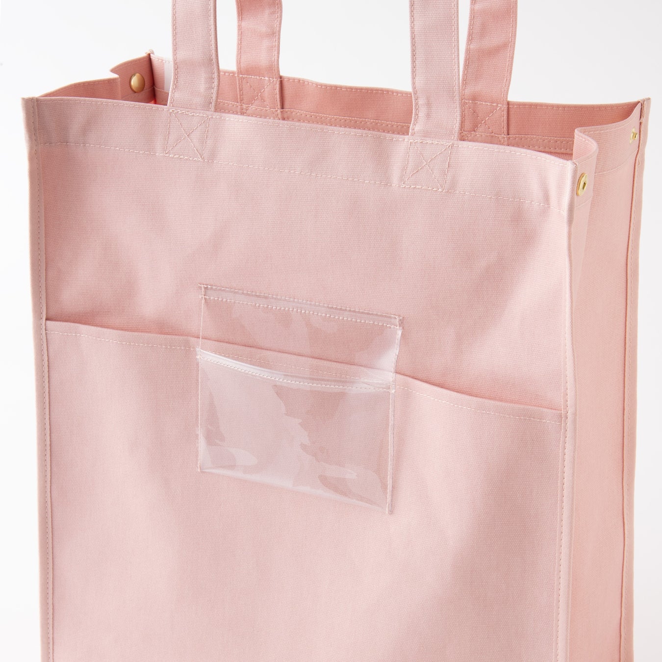 「ロゴ トート M」にはなかった上部のチャックを採用しているので、プライバシー面はより安心してお使いいただけます。また、底鋲が付いており、自立が可能になりました。表生地は水や汚れに強いラミネート加工を施しているので日常使いにはもちろん、一泊二日の旅行などお出掛けにもおすすめです。