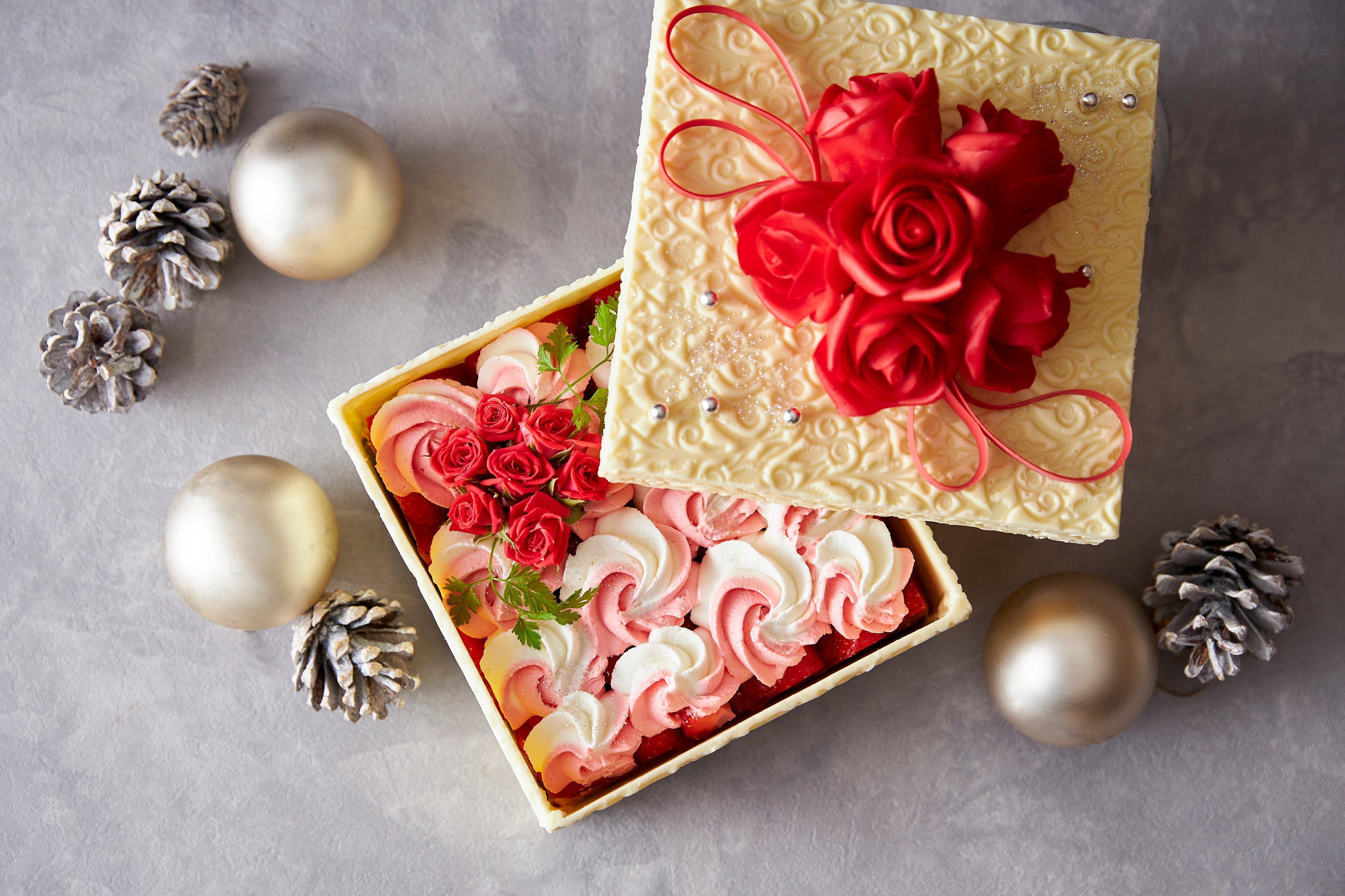 チョコレートでできた真っ赤なバラのブーケを添えた、すべて食べられる豪華なプレゼントボックス。 最上段にはマスカルポーネとベリーの2種のクリームがバラの花束のように並んだ、フランス語で “かわいい贈り物”を意味する「カド- ミニョン」の名称にぴったりのケーキ。クリームの下に隠れた苺タルトとピスタチオショコラのガトーの2層をお楽しみください。