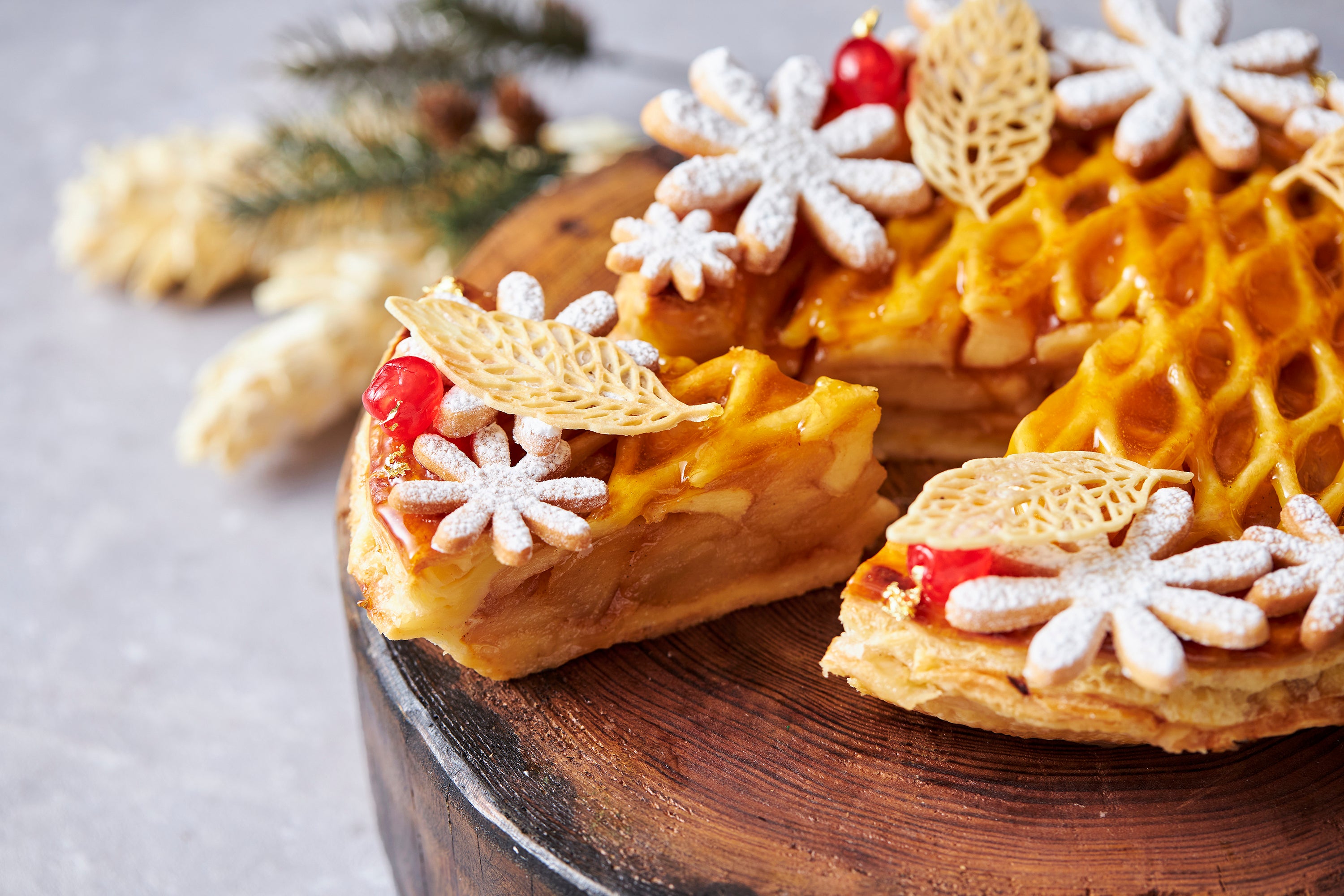 高輪伝統のレシピをもとに、クリスマスリースに見立て華やかにアレンジを加えた、ごろっとした林檎が特徴のアップルパイ。オーガニックバニラでコンポートしたたっぷりの林檎を詰めて丁寧に焼き上げています。花をイメージしたジンジャークッキーなどを飾り付け、バターやシナモンの風味豊かな味わいをご堪能いただけます。