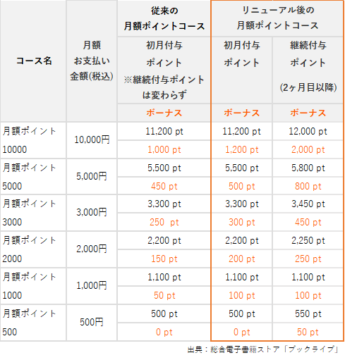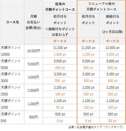 今回のリニューアルによって、従来の月額ポイントコースよりも、初月にもらえるボーナスポイントを増量したお得なメニューを提供いたします。