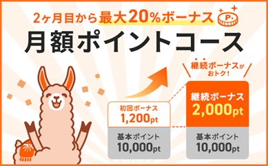 コースに応じてお得なボーナスポイントがもらえ、2ヶ月目以降はボーナスポイントがさらにアップ。最大20%のボーナスポイントがもらえます。例えば、10,000円コースなら初回ボーナスポイントは1,200pt、翌月以降は毎月2,000ptの継続ボーナスポイントがもらえます。