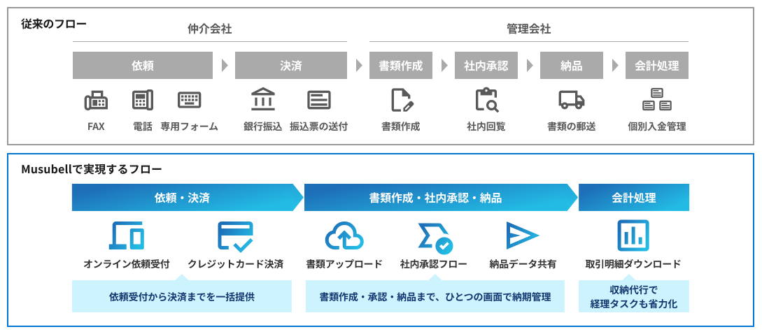 「Musubell」を活用することにより、オンライン経由で仲介会社からの依頼の受け付け、クレジットカードによる決済を行い、社内運用フローに沿った書類の社内承認、仲介会社のマイページへの格納を行うことが可能となります。