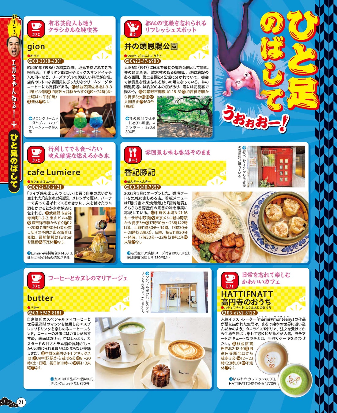 東京エリアからは、「エガちゃんねる」一行がロケをした上野、中野、原宿などを掲載。さらに江頭さんの出身地である佐賀エリアからは神埼、吉野ヶ里、武雄などを紹介しています。聖地巡礼スポットとあわせていきたい観光地、グルメスポットを紹介する「立ち寄りスポット」「ひと足のばして」情報も。「るるぶ」らしく旅に役立つデータ(地図、住所、営業時間、交通情報など)も掲載しています。