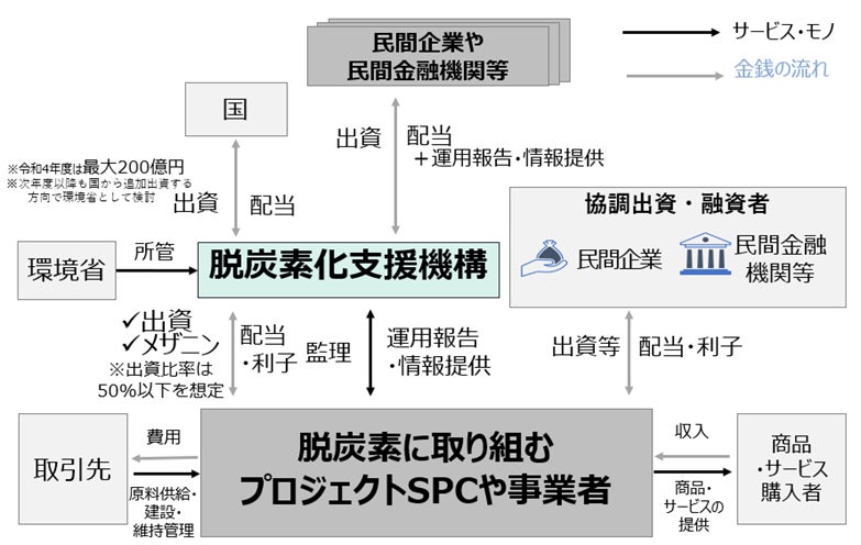 株式会社脱炭素化支援機構は、国の財政投融資(産業投資)と民間からの出資を資本金としてファンド事業を行う株式会社で、資本金を基に、脱炭素に資する事業に対してエクイティ・メザニン等のリスクマネー供給を行い、巨額の民間ESG資金を脱炭素投資に振り向ける呼び水となることを目指し、環境省主導で設立されました。当社は、本機構への出資を通して、脱炭素社会の実現に寄与いたします。