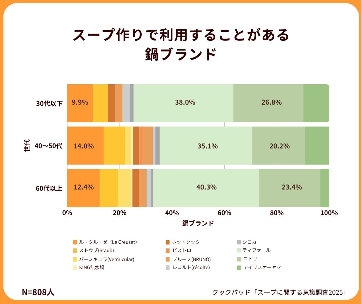 スープ作りに使用する鍋ブランドでは、1位が「ティファール」、2位が「ニトリ」、3位が「ル・クルーゼ」、4位に「アイリスオーヤマ」、5位に「ストウブ」という結果となりました。ティファールやニトリ、アイリスオーヤマはフッ素加工鍋やステンレス鍋を主に展開しており、ル・クルーゼやストウブが鋳物・ホーロー鍋を展開しているブランドです。電子調理鍋を展開するブルーノ、ホットクック、シロカもランクインしました。