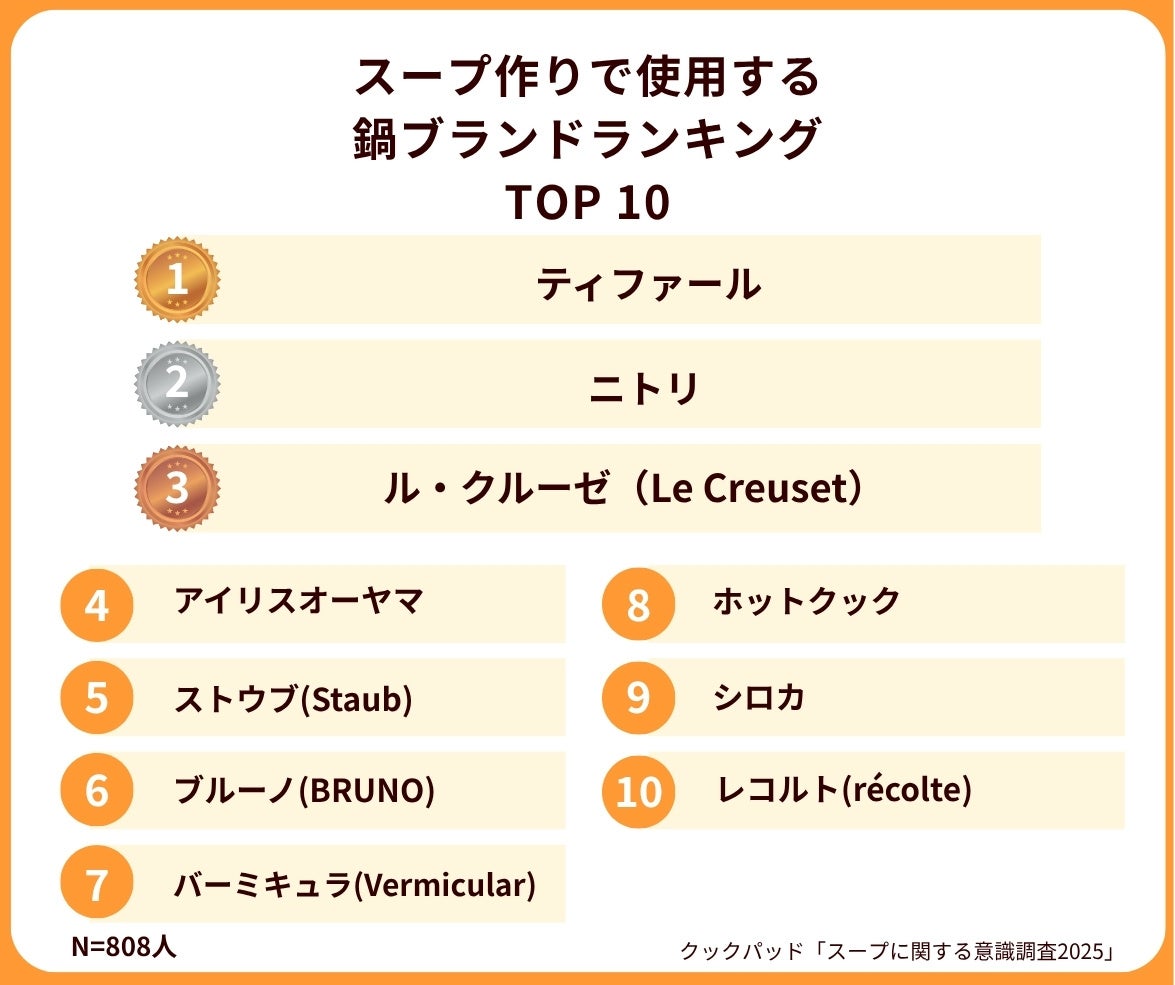 スープ作りで人気の鍋のブランドは1位が「ティファール」、2位が「ニトリ」、3位が「ル・クルーゼ」という結果に