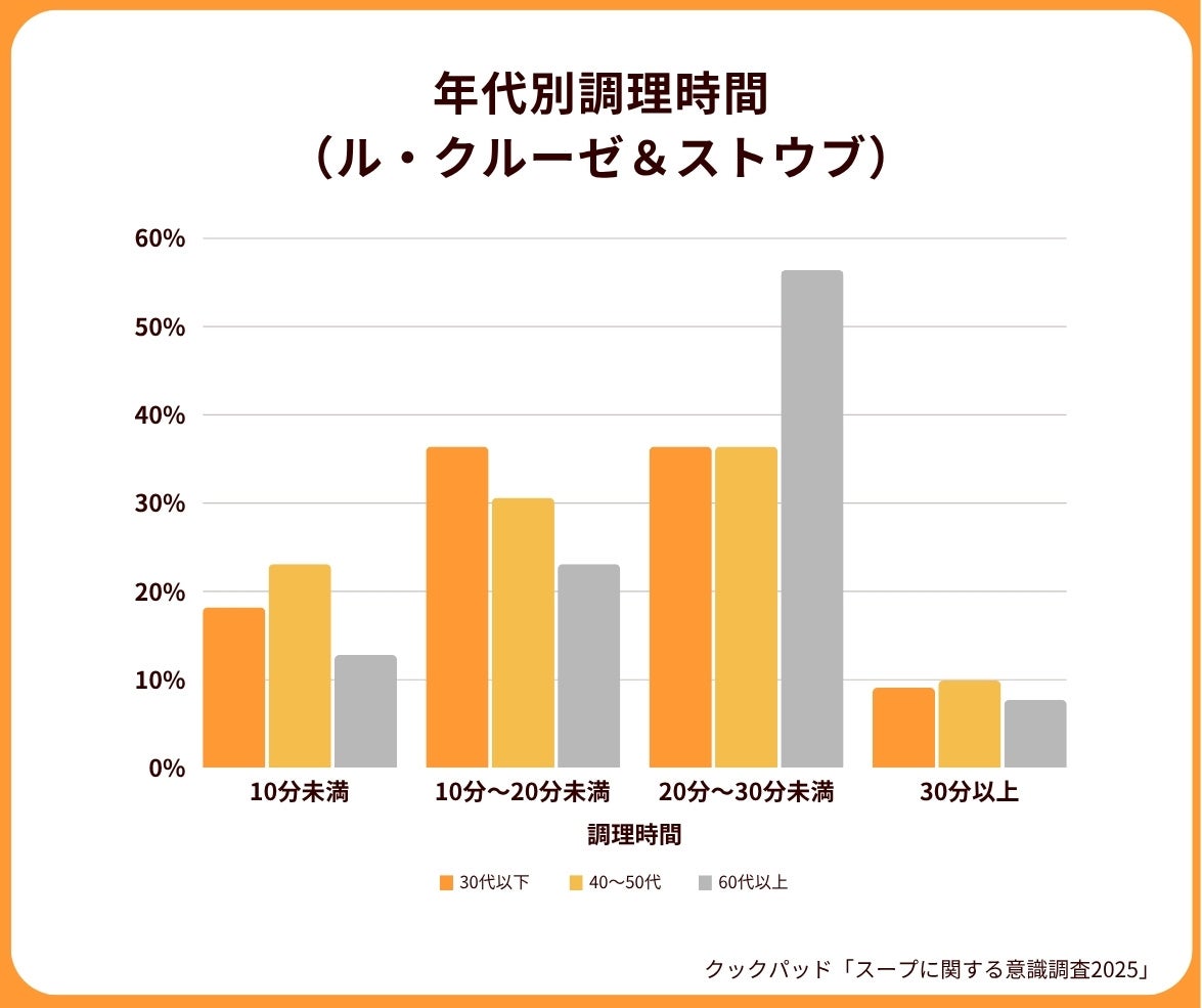特に注目すべきは、20〜30代の若い世代がル・クルーゼやストゥブといった本来じっくり煮込むことに向いている鋳物鍋を使っていても、10〜20分の時短調理をしているという点です。これは「良い道具を使いたい」という調理器具へのこだわりがある一方、「効率的に料理をしたい」という時短ニーズががあり、それらを両立したいという若者世代の料理スタイルを象徴しています。一方で60代以上の方々は、時間をかけて丁寧にスープを作ることそのものを楽しんでいる様子が伺え、料理が生活の質を高める時間として位置づけられていることが見て取れます。