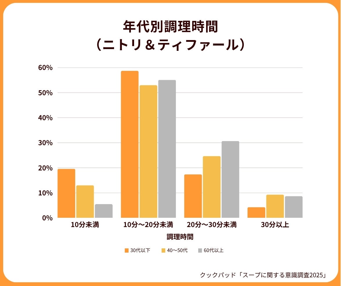 世代別にみると、20~30代はニトリやティファール使用で「10~20分未満」が最も多い結果となりましたが、ル・クルーゼやストウブを使う方も「10~20分未満」の使用が多く、スープ作りに時間をかけない時短派であることが見受けられました。60代以上のル・クルーゼとストウブを使用する方の調理時間は「20~30分未満」が他の世代より突出して多く、仕事や子育てが落ち着いた世代で、時間に余裕がある方で長時間調理に向く鋳物鍋でじっくりコトコトスープを作る方が多いことが伺えます。