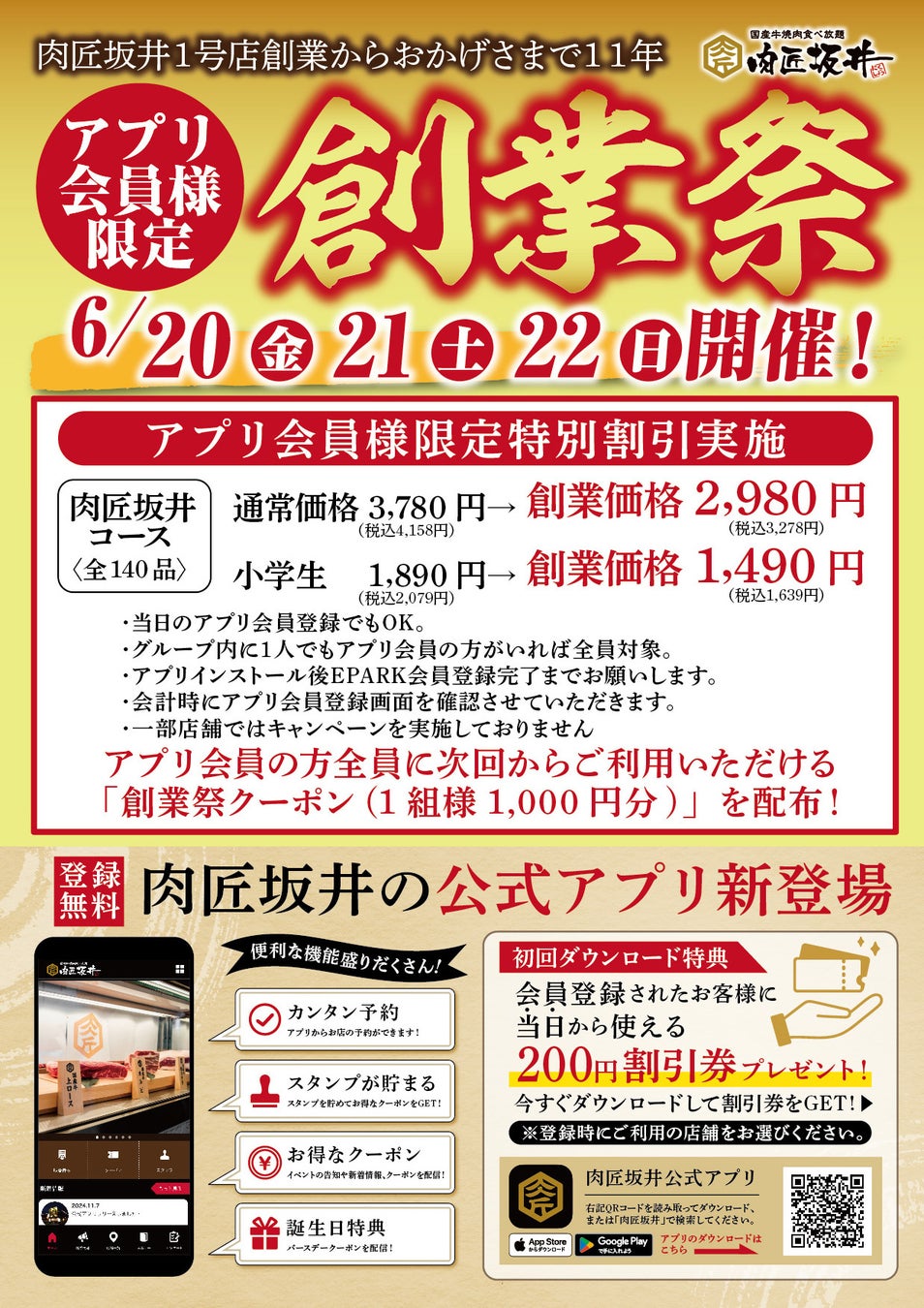 全ての店舗に「肉職人」を配属し、手切りで厳選したこだわりの国産牛の焼肉を、食べ放題で楽しむ「肉匠坂井」では、6月20日(金)から3日間、アプリ会員様限定「創業祭」を開催します。全140品食べ放題の「肉匠坂井コース」を創業価格で提供させていただきます。2014 年6 月20 日に三重県鈴鹿市の幹線道路沿いに1 号店を出店してから11年、皆さまへの感謝の気持ちをこめた特別な3日間です。ぜひ、この機会にご利用ください。皆様のご来店をスタッフ一同お待ちしております。