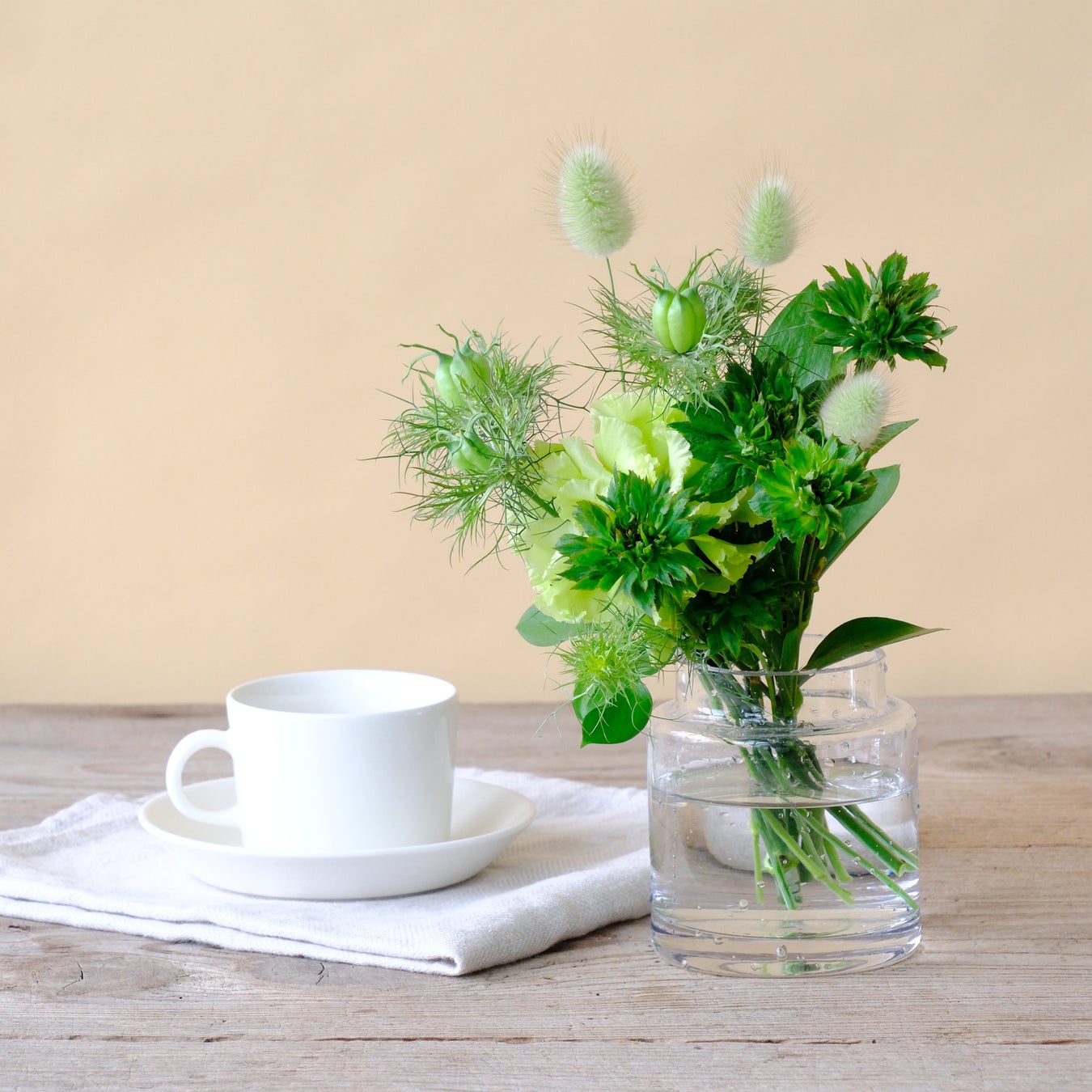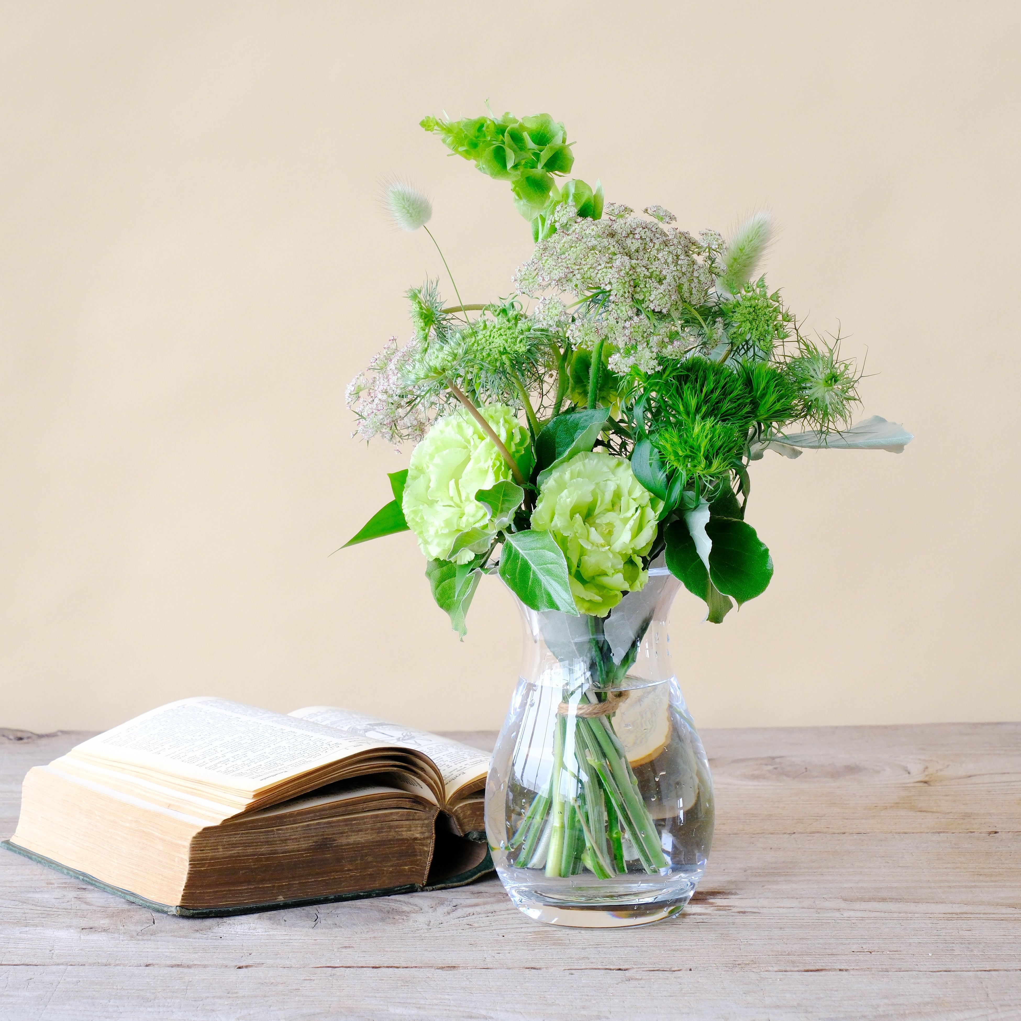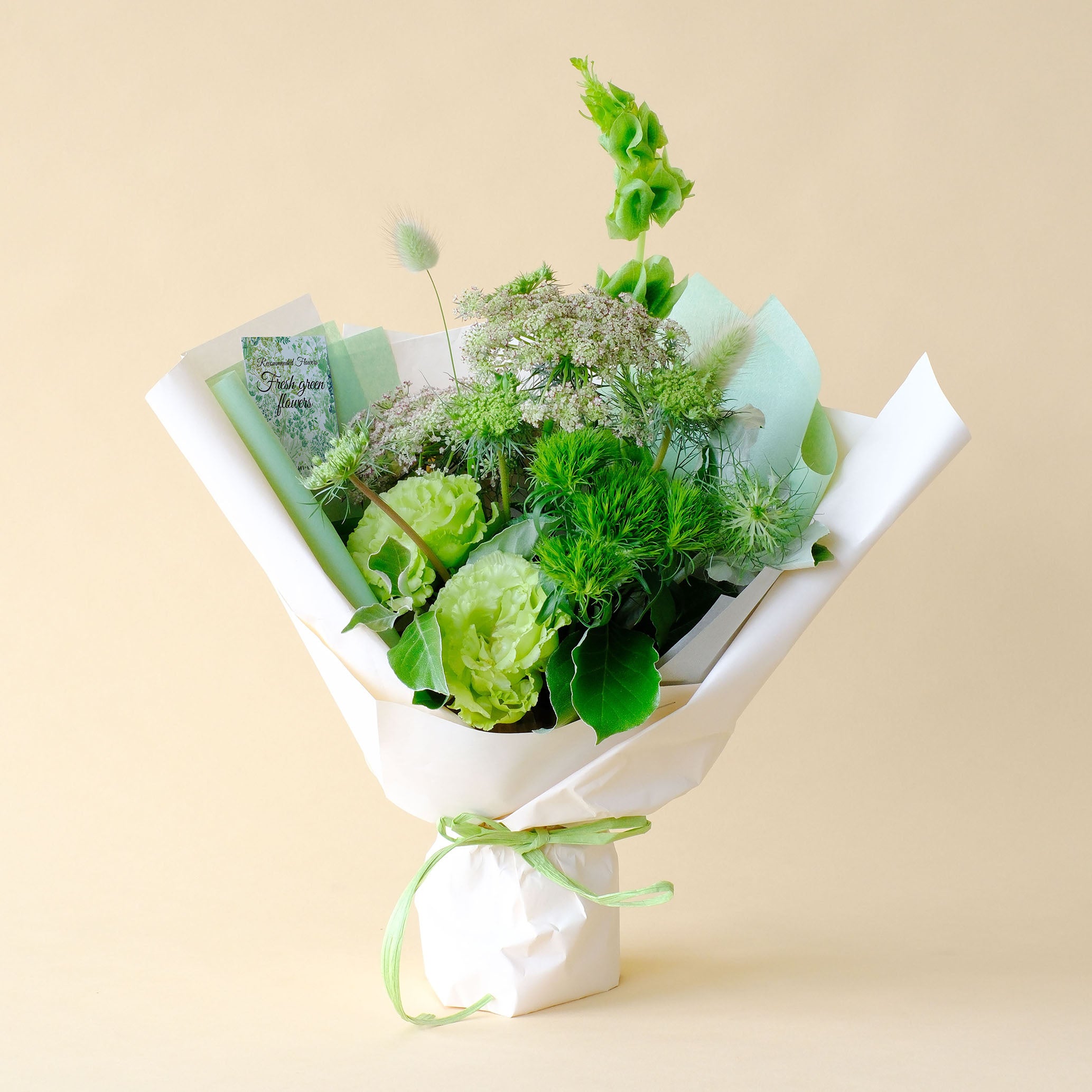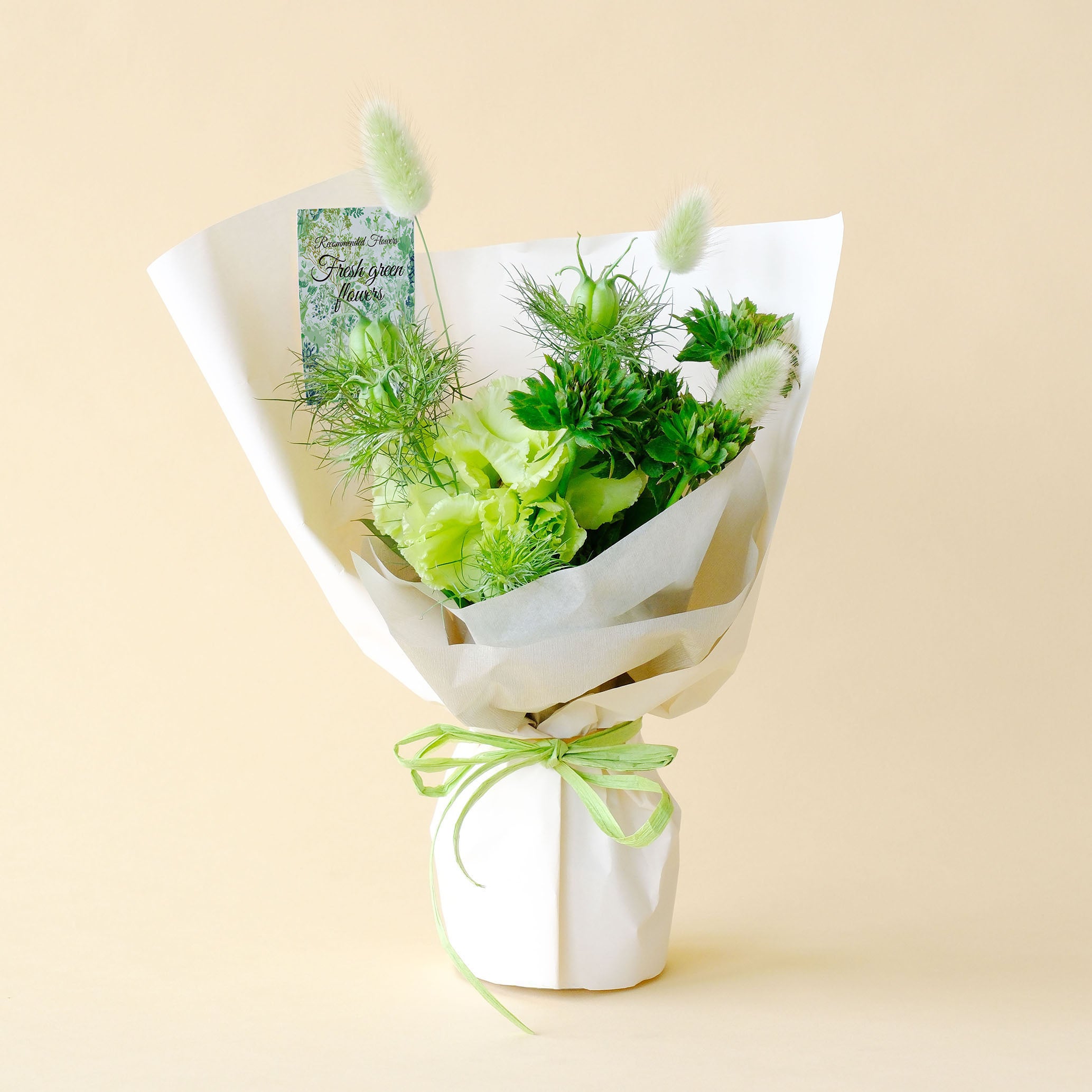 ショップおすすめの新緑色の花々をシンプルなブーケに仕上げました。コンパクトなサイズでちょっとしたギフトやご自宅用にもおすすめです。