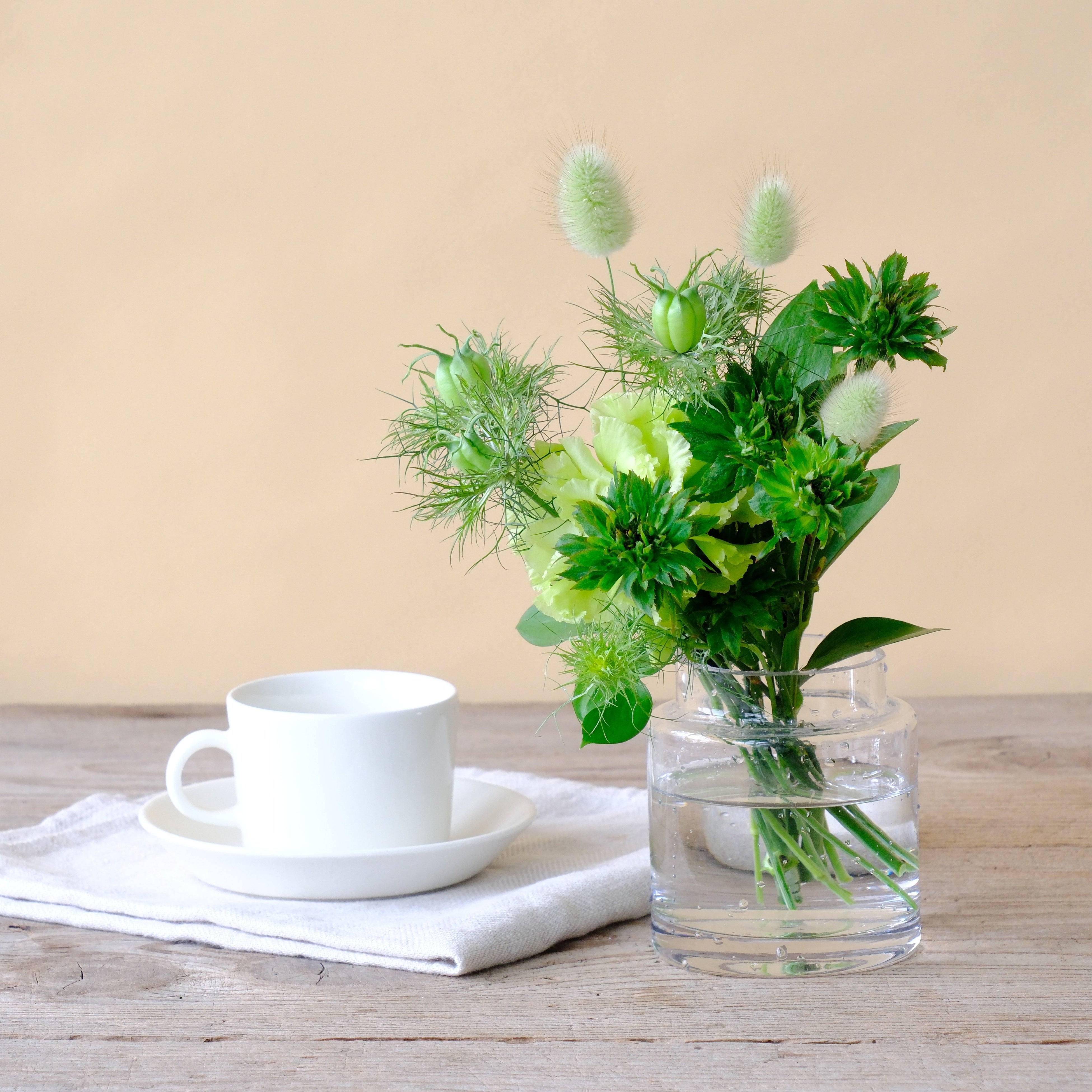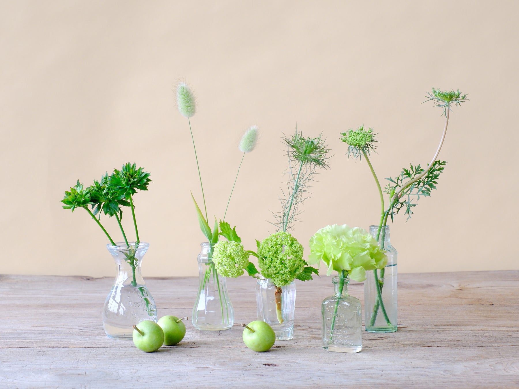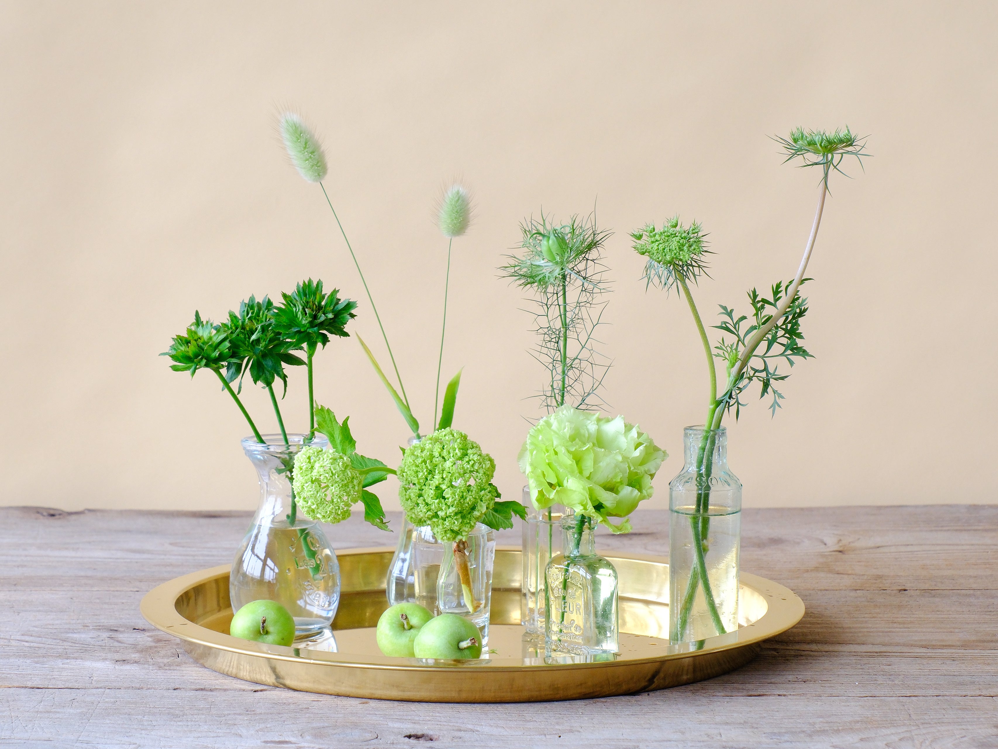 新緑色の花々は、飾る場所やスタイルを選びません。リビングやデスク、玄関先など、暮らしのさまざまなシーンになじみますので、観葉植物のように気軽に楽しんでいただけると思います。