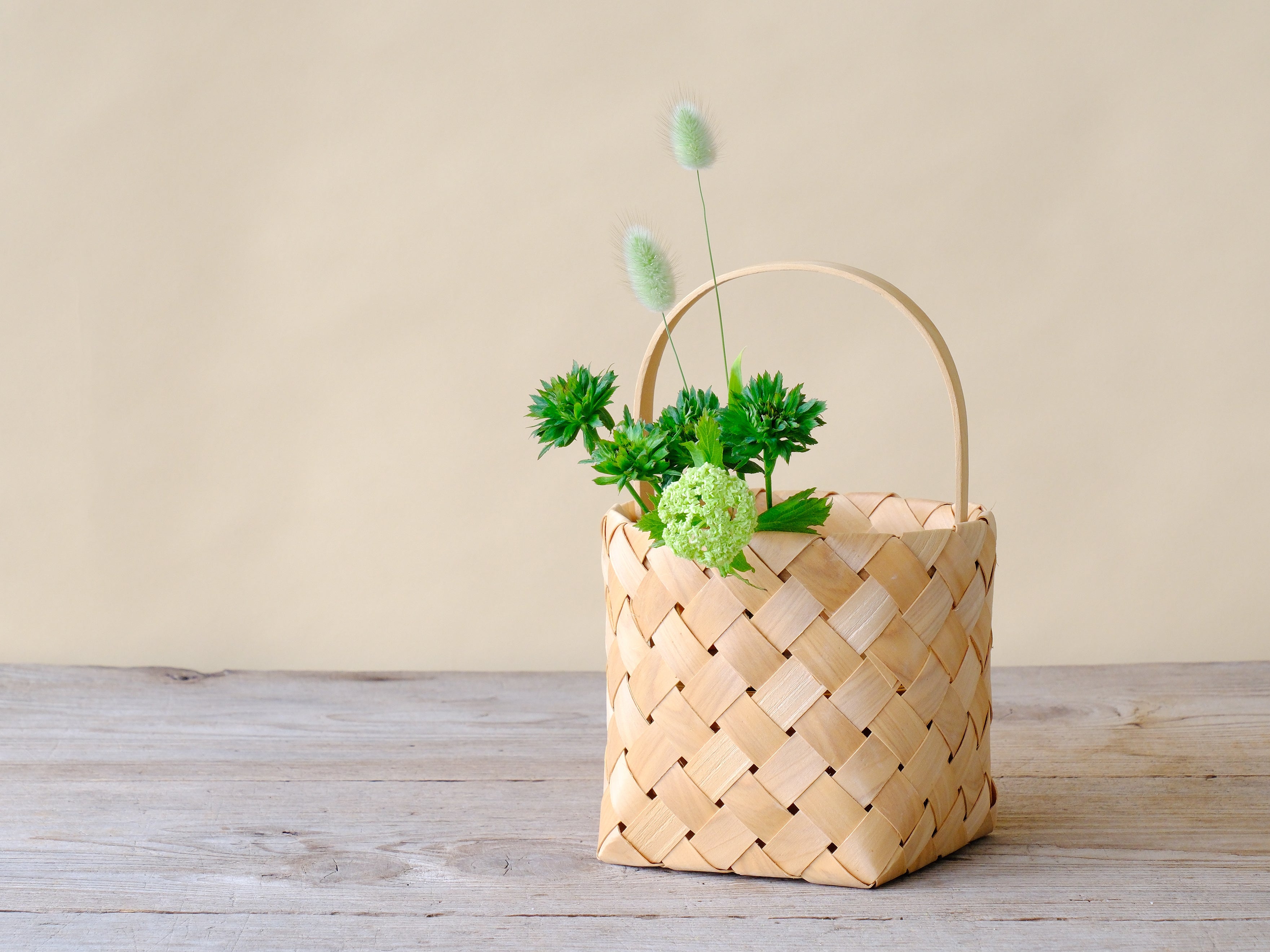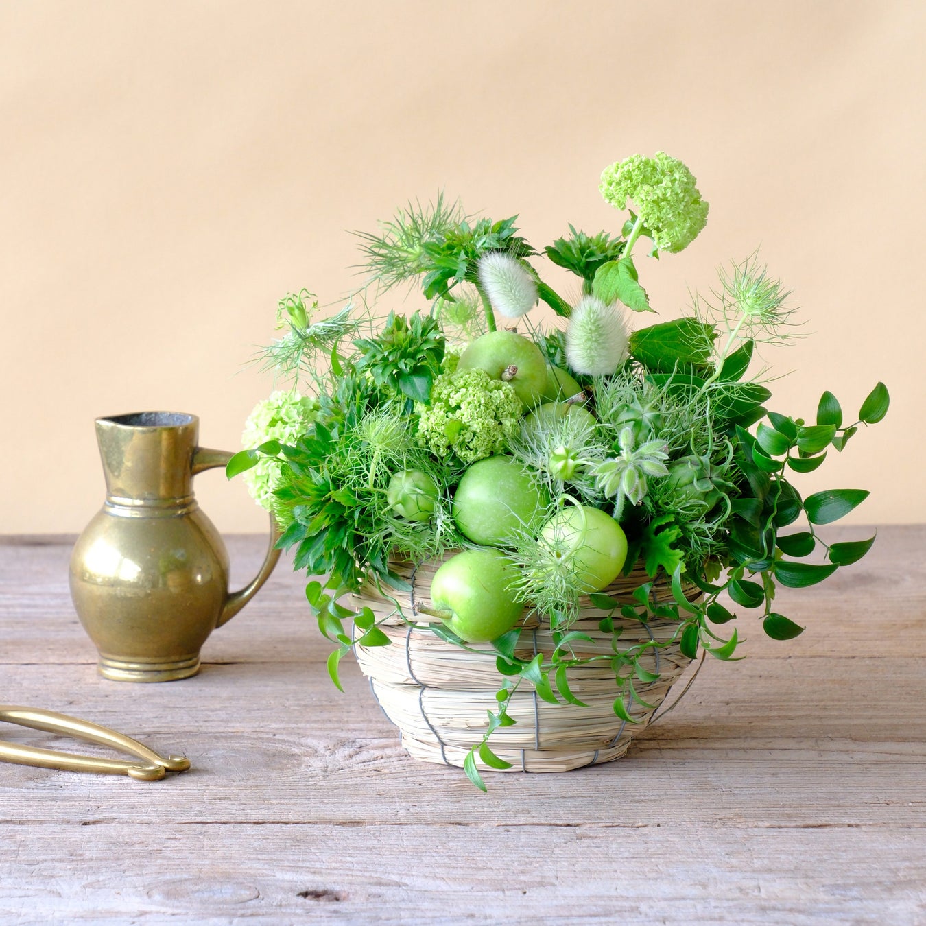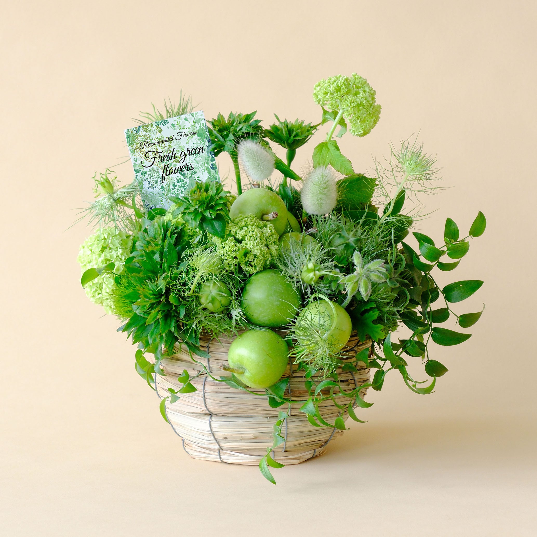 ショップおすすめの新緑色の花々をナチュラルなアレンジメントに仕上げました。器付きでそのまま飾って楽しめます。