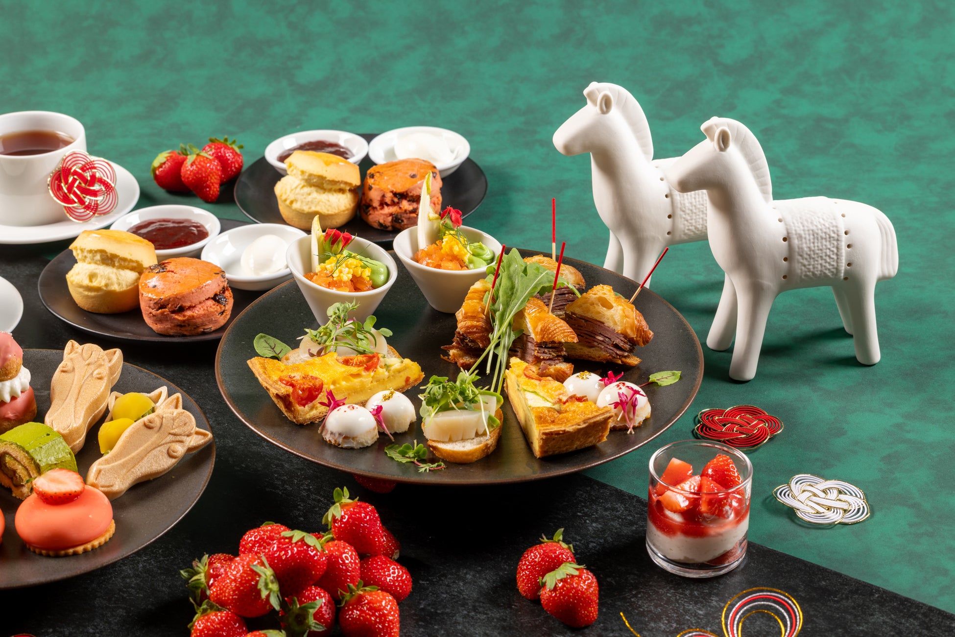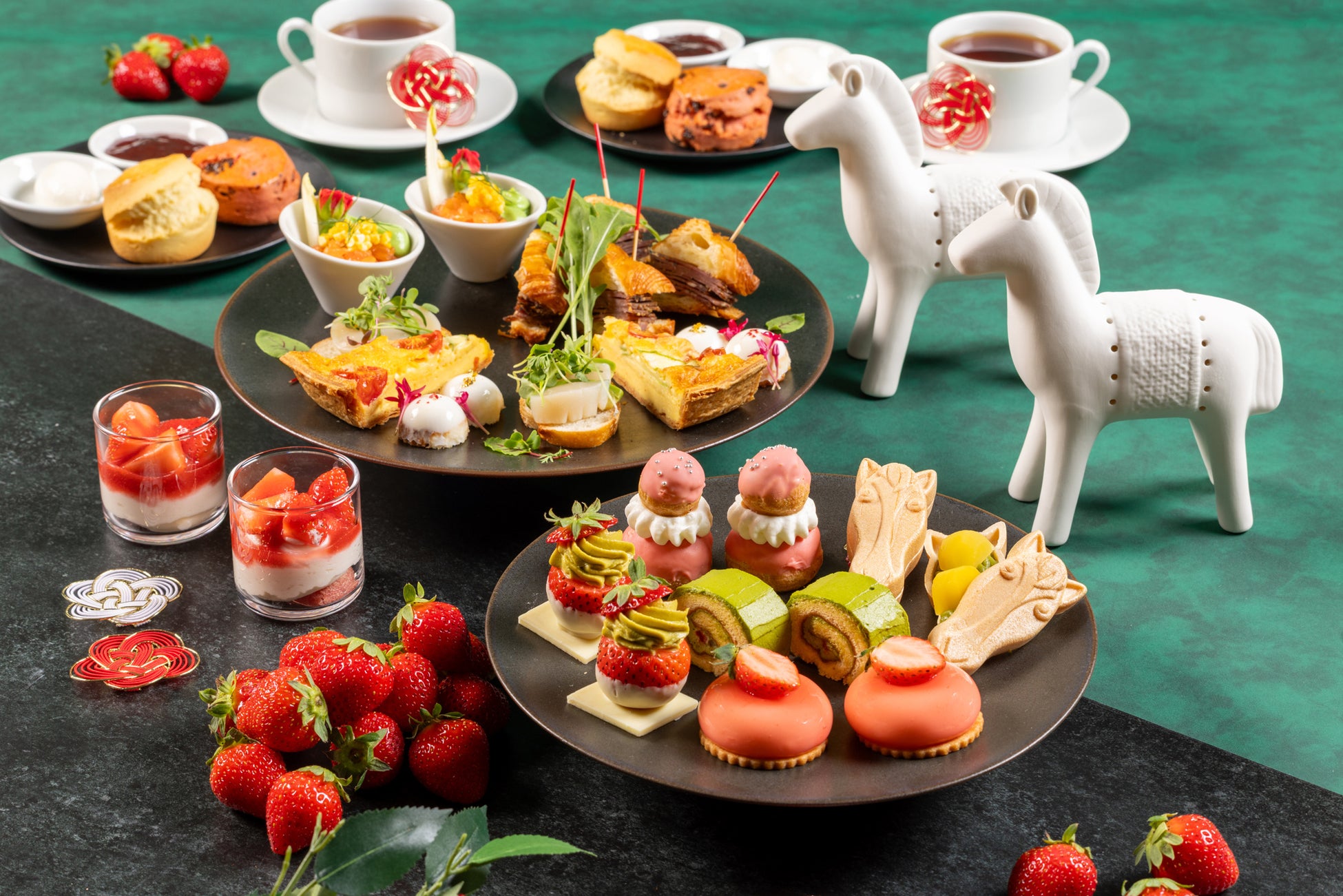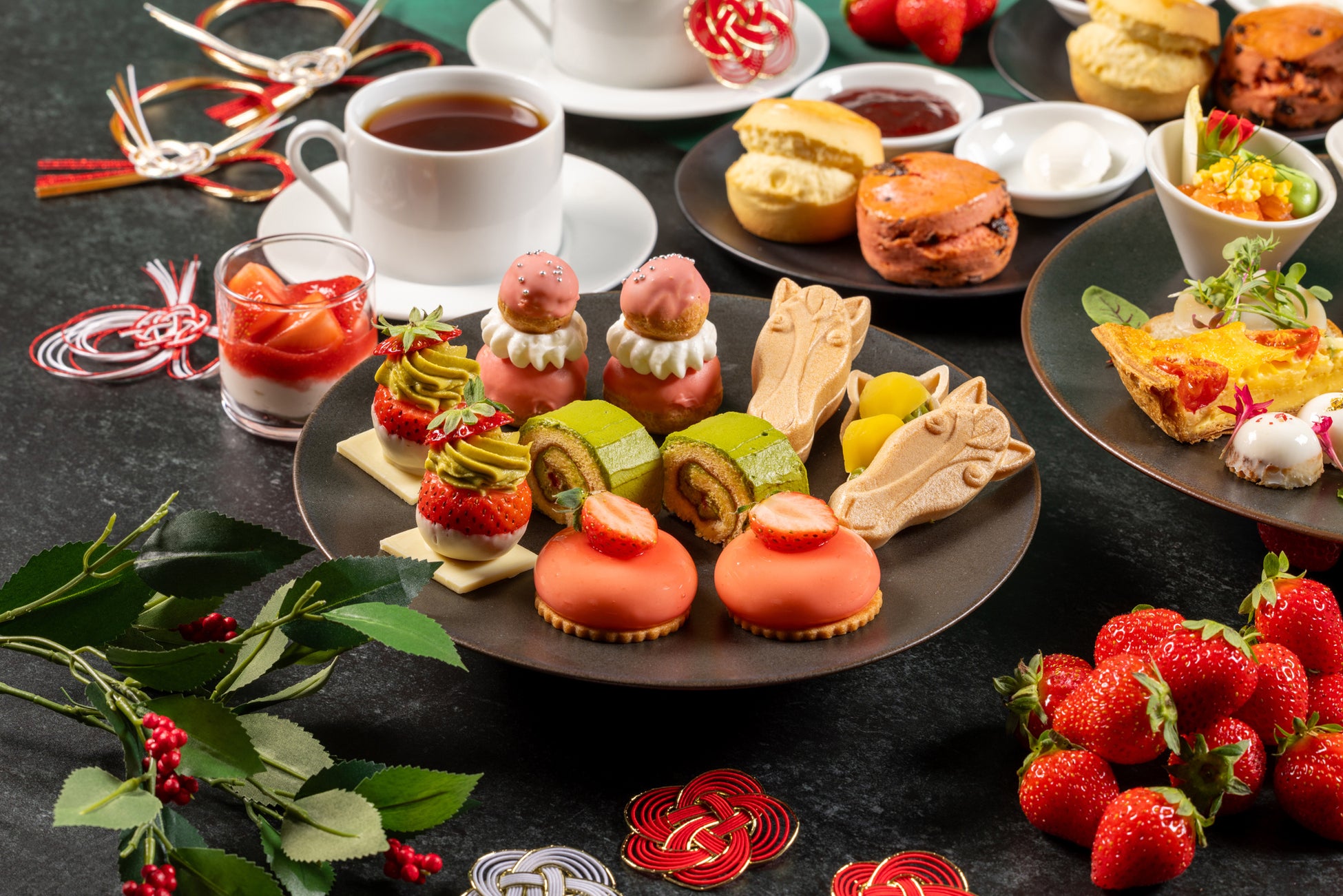 セイボリーには、ホテルメイドのビーフパストラミを10層に重ね、バターが香る自家製クロワッサンで挟んだサンドイッチをはじめ、金箔で新年の華やかさを演出したモッツァレラチーズムースをご用意いたします。さらに、桜チップで約8時間燻してつくる自家製スモークサーモンと、まろやかなブロッコリーピューレを合わせるタルタルもご堪能いただけます。また、アフタヌーンティーに欠かせないスコーンは、プレーンのほかに、ドライストロベリーとチョコレートを練りこんで焼き上げる2種類をお楽しみいただけます。