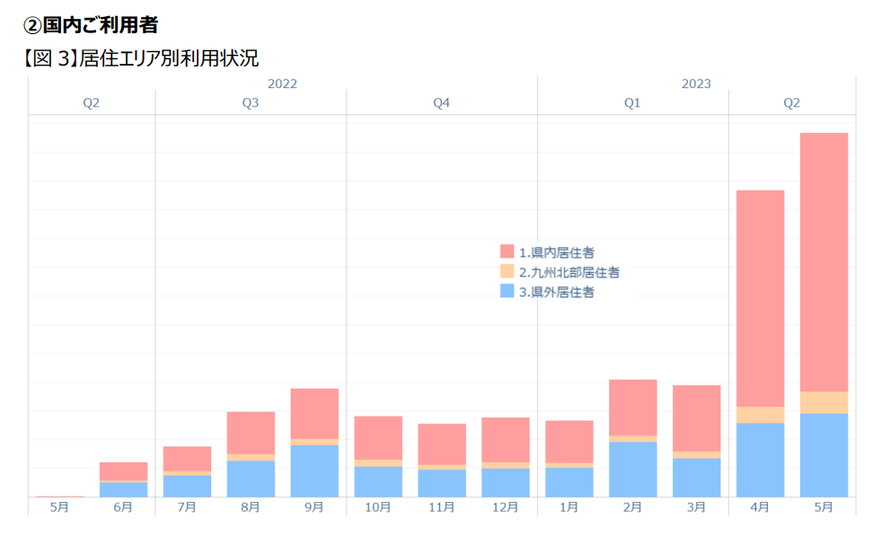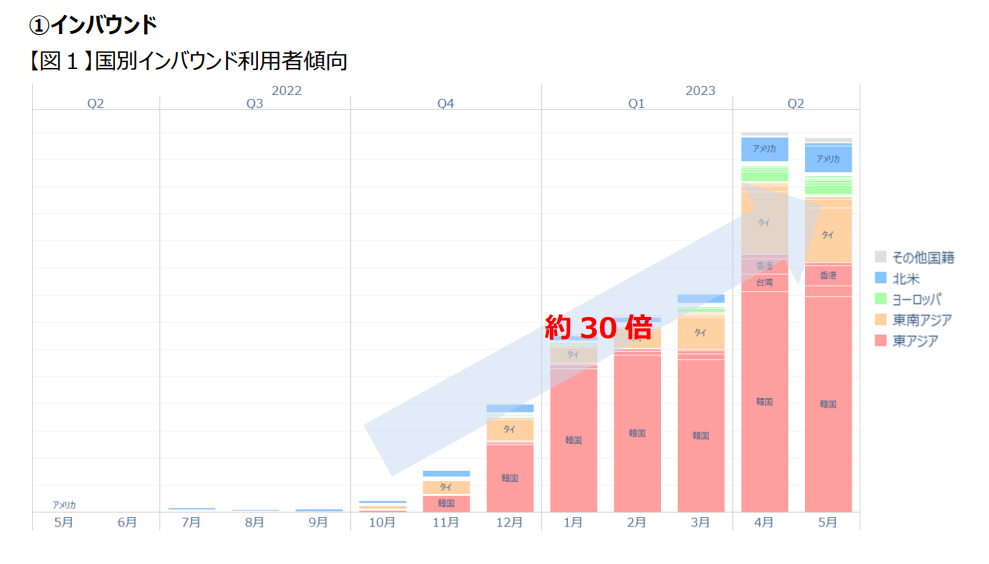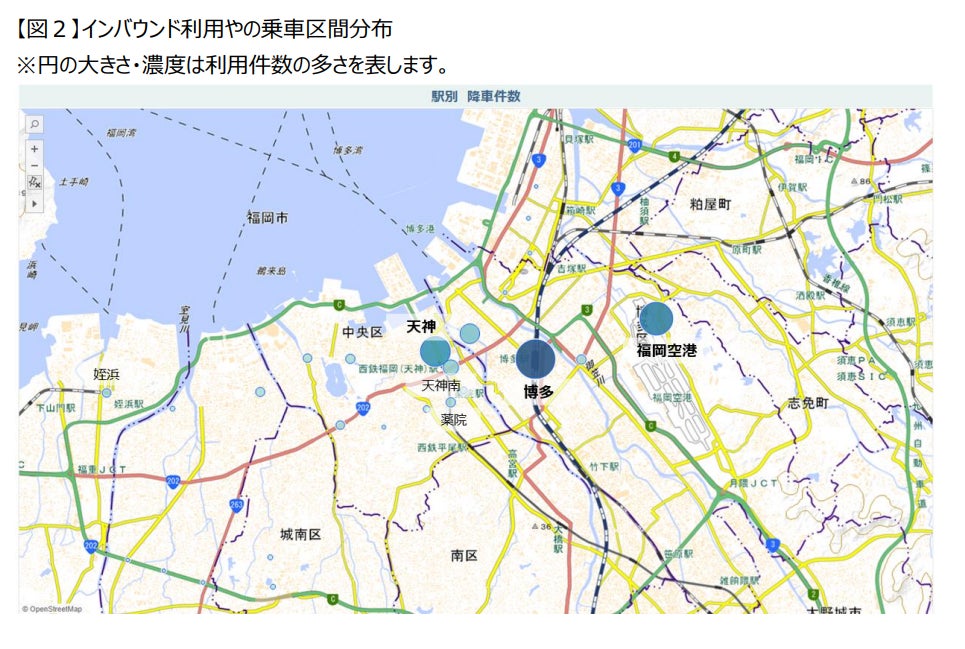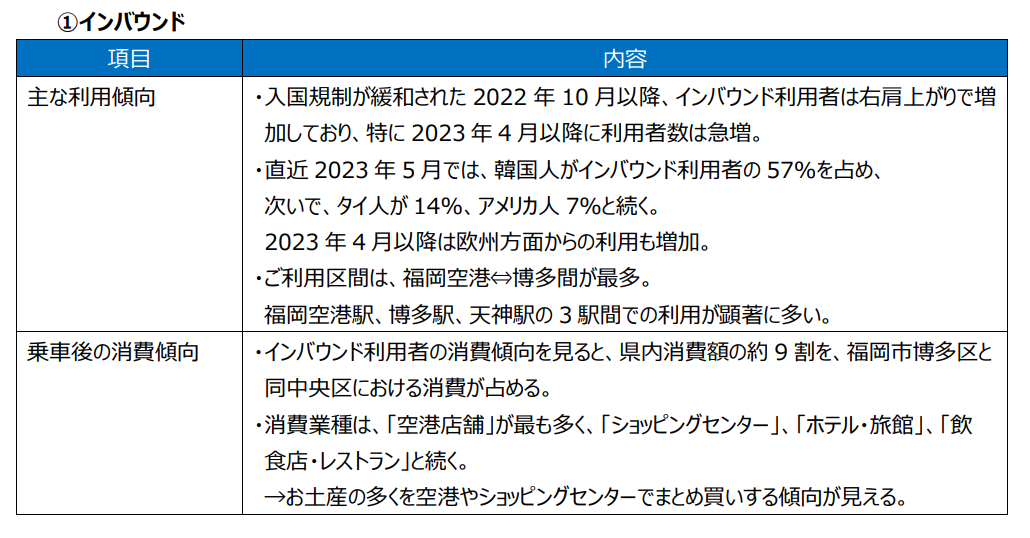 | 主な利用傾向 | ・入国規制が緩和された2022年10月以降、インバウンド利用者は右肩上がりで増加しており、特に2023年4月以降に利用者数は急増。 ・直近2023年5月では、韓国人がインバウンド利用者の57%を占め、次いで、タイ人が14%、アメリカ人7%と続く。 2023年4月以降は欧州方面からの利用も増加。 ・ご利用区間は、福岡空港⇔博多間が最多。福岡空港駅、博多駅、天神駅の3駅間での利用が顕著に多い。 |