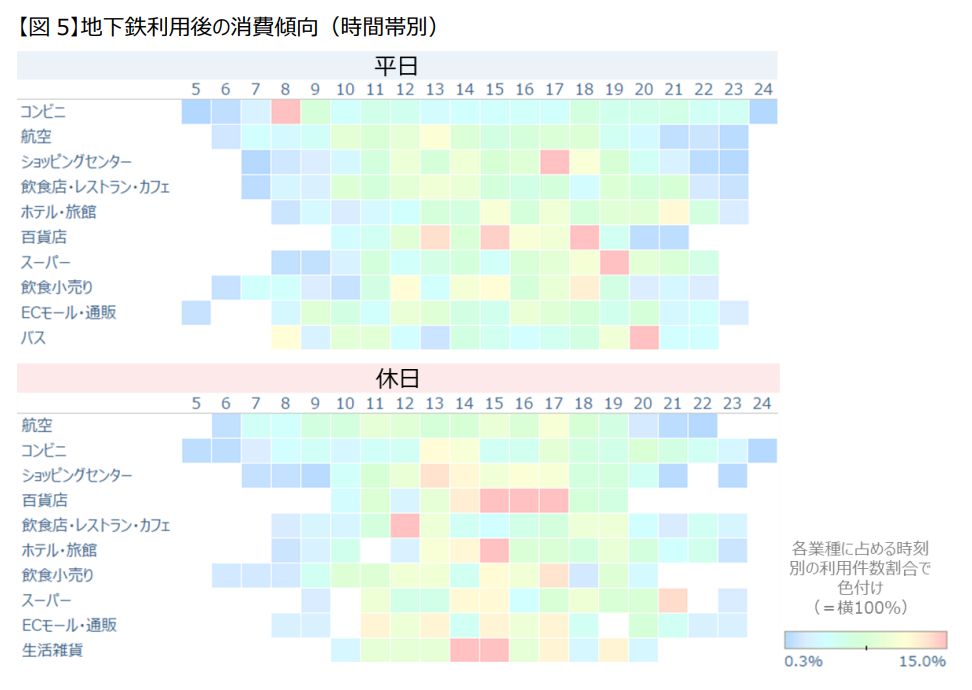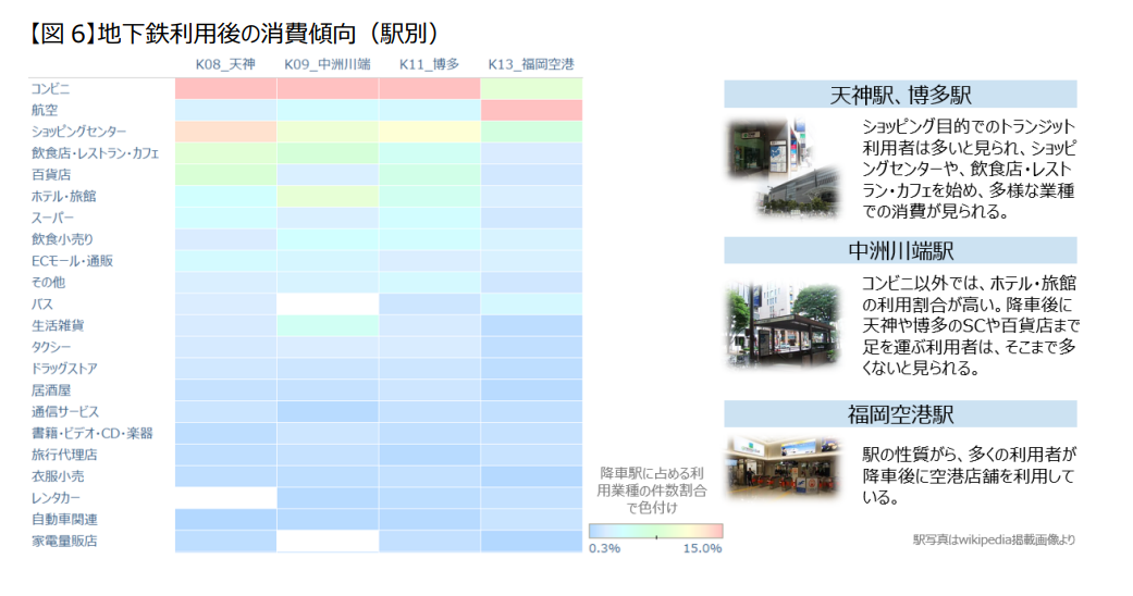 | 乗車後の消費傾向 | ・平日は、出勤時のコンビニ利用、帰宅時のスーパー利用が多い。 ・休日は、ショッピングセンターや百貨店の利用が、平日と比較して高い。福岡空港駅があることから、空港店舗の利用も目立つ。 |