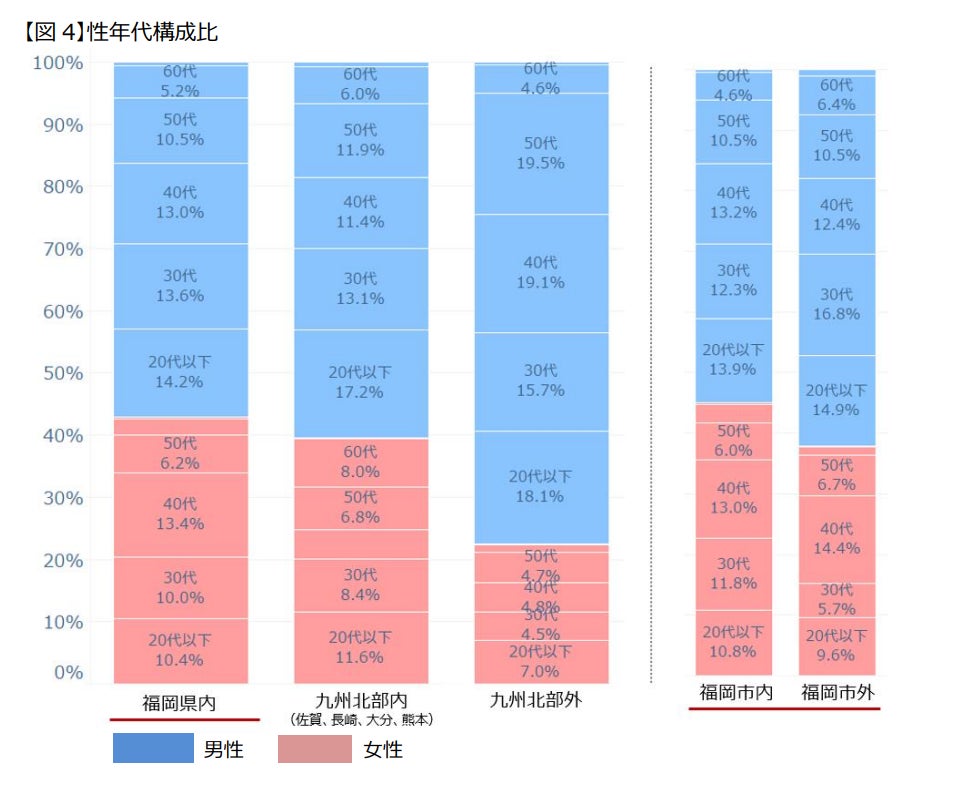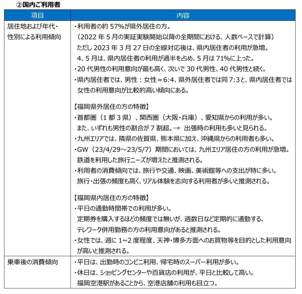 | 居住地および年代・性別による利用傾向 | ・利用者の約57%が県外居住の方。 (2022年5月の実証実験開始以降の全期間における、人数ベースで計算) ただし2023年3月27日の全線対応後は、県内居住者の利用が急増。 4、5月は、県内居住者の利用が過半を占め、5月は71%に上った。 ・20代男性の利用意向が最も高く、次いで30代男性、40代男性と続く。 ・県内居住者では、男性:女性=6:4、県外居住者では同7:3と、県内居住者では女性の利用意向が比較的高い傾向にある。 【福岡県外居住の方の特徴】 ・首都圏(1都3県)、関西圏(大阪・兵庫)、愛知県からの利用が多い。 また、いずれも男性の割合が7割超。→ 出張時の利用も多いと見られる。 ・九州エリアでは、隣県の佐賀県、熊本県に加え、沖縄県からの利用者も多い。 ・GW(23/4/29~23/5/7)期間においては、九州エリア居住の方の利用が急増。 鉄道を利用した旅行ニーズが増えたと推測される。 ・利用者の消費傾向では、旅行や交通、映画、美術館等への支出が特に多い。 旅行・出張の頻度も高く、リアル体験を志向する利用者が多いと推測される。 【福岡県内居住の方の特徴】 ・平日の通勤時間帯での利用が多い。 定期券を購入するほどの頻度では無いが、週数日など定期的に通勤する、テレワーク併用勤務の方の利用意向があると推測される。 ・女性では、週に1~2度程度、天神・博多方面へのお買物等を目的とした利用意向が高いと推測される。 |