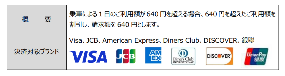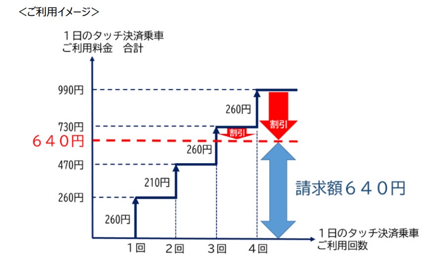 今般、7月7日より、新たな取り組みとして、1日のご利用額が640円を超える場合、640円を超えたご利用額を割引するサービスを開始いたします。お客さまはタッチ決済により地下鉄に乗車する場合には、1日に何度乗車しても、640円を超えた金額を請求されることはありません。これにより、観光などの際には、これまでよりも便利に地下鉄をご利用いただけます。なお、1日乗車券の購入など、事前のお手続きは一切不要です。なお、本サービスは、鉄道としては全国初の取組みとなります。