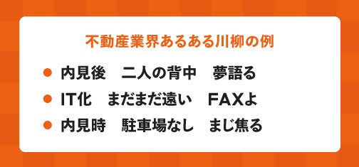 不動産業界(不動産仲介・管理会社)に従事している方々が日々携わっている業務の中で体験されたさまざまなエピソードを川柳で表現していただきます。日頃から感じている不動産業界の喜怒哀楽や心の声を、五・七・五の川柳にのせてご応募ください。