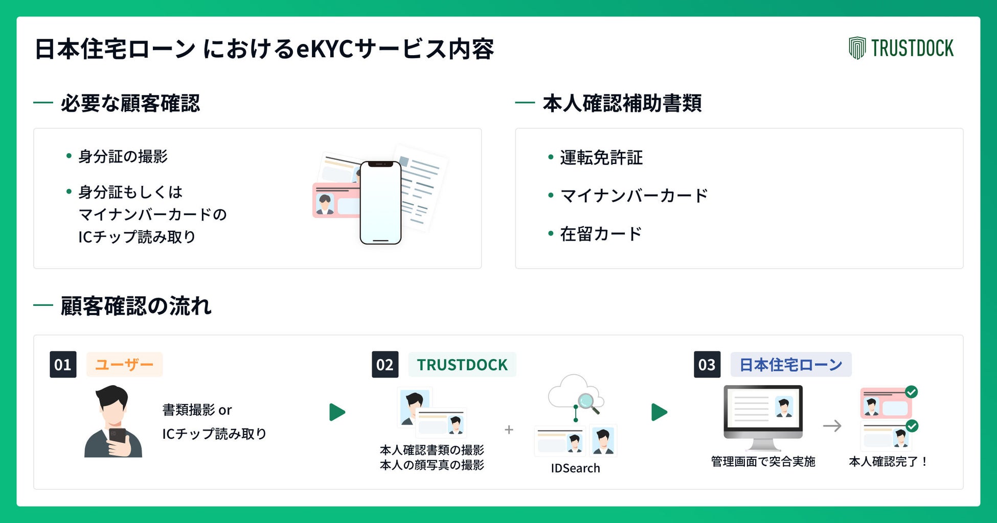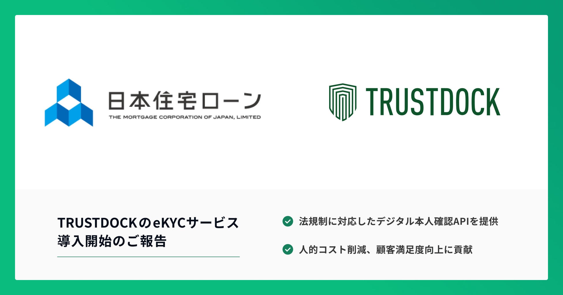 株式会社TRUSTDOCK(東京都中央区、代表取締役:千葉 孝浩)は、日本住宅ローン株式会社(東京都渋谷区、代表執行役社長:安藤 直広)が展開するローン商品に、eKYCサービス「TRUSTDOCK」の提供を開始いたしました。