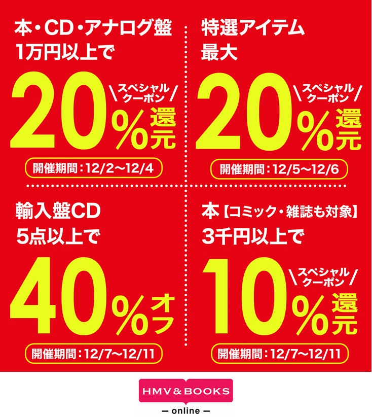 HMV&BOOKS onlineでは、本・CD・アナログ盤の対象商品を1万円(税込)以上まとめてお買い上げいただくと、購入金額20%分をスペシャルクーポンで還元いたします。