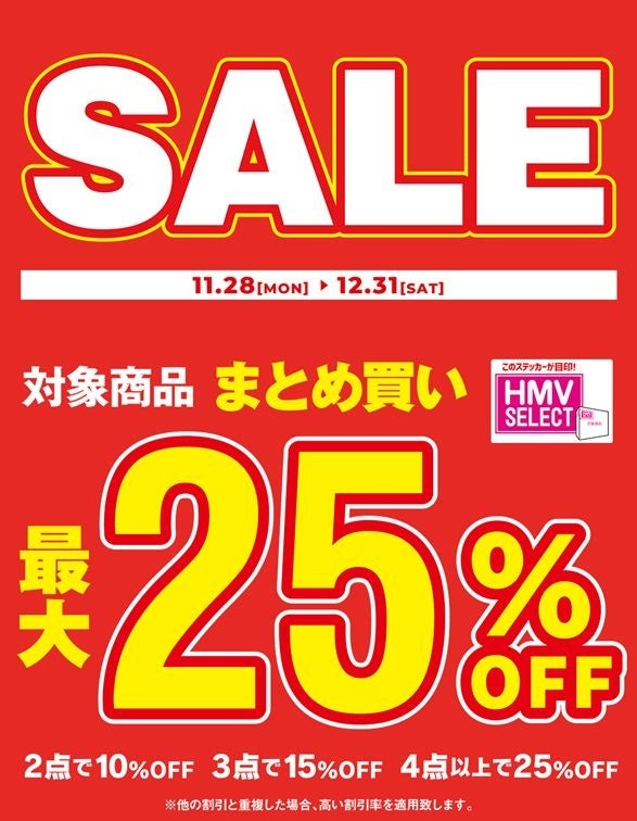全国のHMV/HMV&BOOKS 店舗では、今年の話題盤や人気アーティストのベスト盤、一家に一枚の定番タイトル、大人気のK-POP輸入盤などを中心に、HMVが厳選した対象商品がまとめ買いで最大25%オフになるスペシャルセールを開催します!