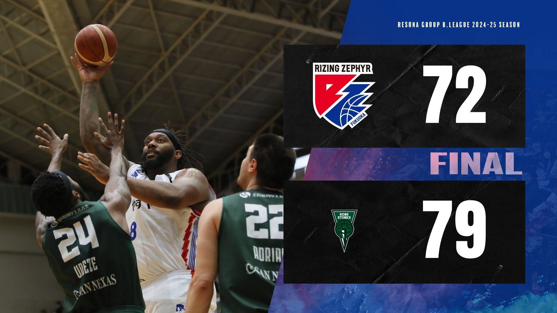 2024年12月29日(日)に開催されました、りそなグループB.LEAGUE 2024-25シーズン第15節【神戸ストークス vs.ライジングゼファーフクオカ】の結果は、“神戸79-72福岡”で福岡の敗戦となりましたことを、お知らせいたします。