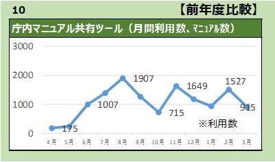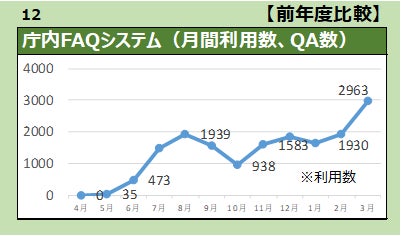 作成したマニュアルは、令和6年4月時点で53個でしたが、令和7年3月には329個に、庁内FAQは令和6年5月時点で30個、令和7年3月には1,066個に増えています。(グラフは利用数)
