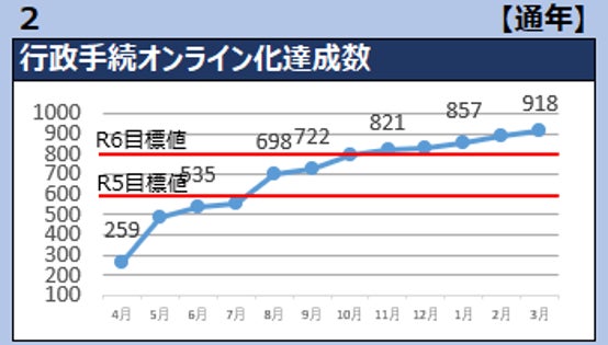 法令等で対面が必要な一部を除き、令和6年度末時点で行政手続の84.8%(918件/1083件)をオンライン化。令和7年度内の全手続対応完了を目指し、利便性向上を推進しています。