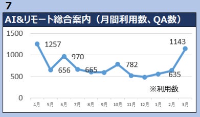 市役所本庁舎1階にAI&リモート総合案内(タッチパネル式デジタルサイネージ(ディスプレイ)を用いて庁舎内の行先案内や簡単なお問合せに対応)を設置しています。令和7年3月時点で1,455個のFAQを搭載し、月間平均600件程度の問合せを受け付け、年度末の繁忙期(転入転出など)には多くの市民にご利用いただきました(3月度は1,143件)。気兼ねなくいつでもサービスが提供できるようにするための第一歩として取り組んでいます。
