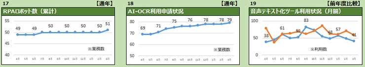 業務効率化に向けてさまざまなDXツールを導入しています。パソコンを使った手作業をロボットが自動的に行うRPA(ロボティックプロセスオートメーション)、手書き等の紙の申請書等からデータに変換するAI-OCR、会議録等の録音データから文字起こしを自動で行う音声テキスト化ツールについて、利用が進んでいます。
