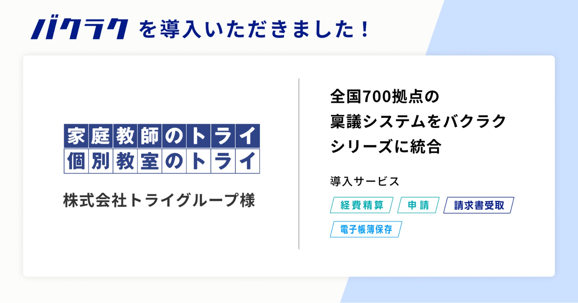 この度、トライグループに「バクラク経費精算」「バクラク申請」「バクラク請求書受取」「バクラク電子帳簿保存」が導入されました。