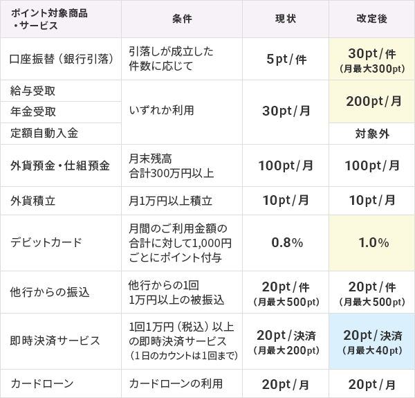 保険料の引落等でご利用いただける「口座振替」や「給与・年金受取」でのポイント増額のほか、デビットカードのポイント還元率も0.8%から1%にアップし、保険契約者さまをはじめ、多くのお客さまにとってよりメインバンクとしてお使いやすい銀行サービスに生まれ変わります。