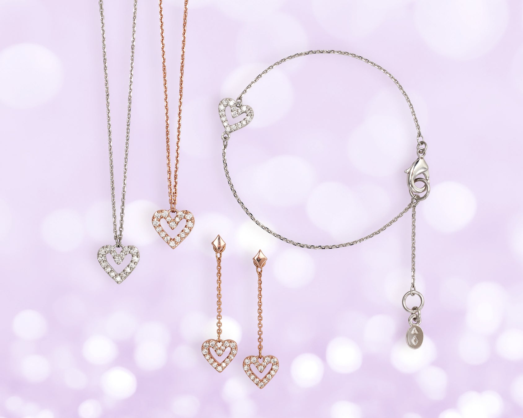 手書き風のアウトラインで描かれたハートが可愛らしいコレクション。細身のラインと抜け感のあるハートは、大人の上品な愛らしさを感じられます。キュービックジルコニアの輝きが美しく、ピアス(イヤリング)は揺れ感があり、顔まわりに華やかさを添えてくれます。
