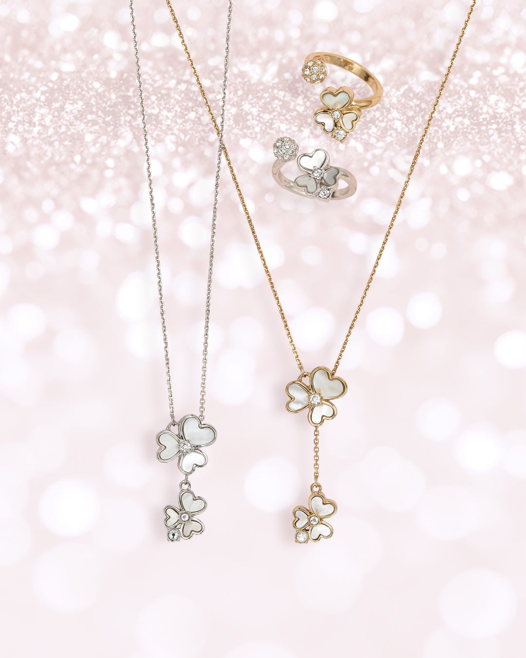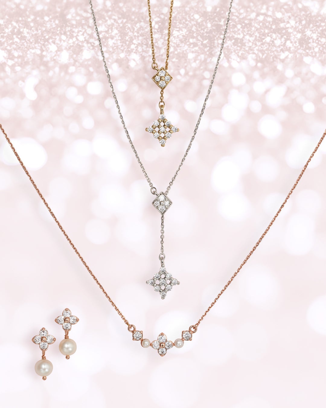 フィオーリモチーフは肌なじみのいいピンクゴールドカラーと艶やかな淡水パールが胸元を明るく演出します。