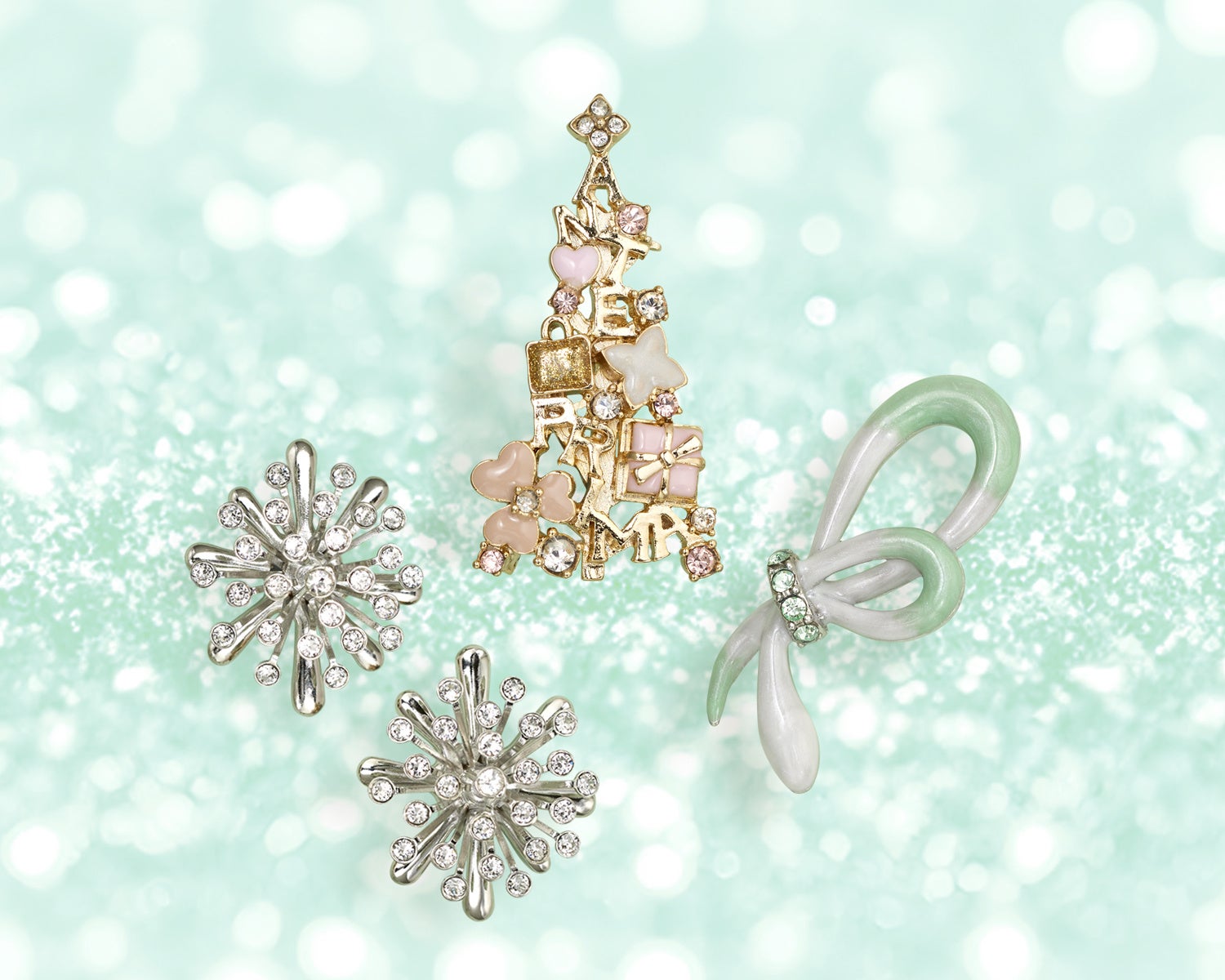 ワイヤーバッグやフィオーリ(花)、ハートやロゴが飾られた賑やかで遊び心のあるクリスマスツリーや、来年の干支であるヘビを優しい色合いで結びこまれたリボンのようなデザインで表現したブローチ。スタイリングのアクセントにおすすめです。