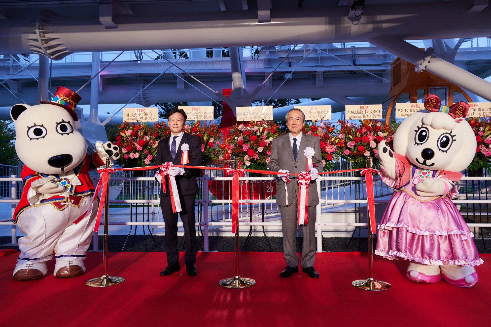 その後、観覧車の新設にご協力いただきましたサノヤス・ライド株式会社代表取締役社長大門淳様、よみうりランドマスコットキャラクター グッド&ラッキーとともにテープカットを行いました。