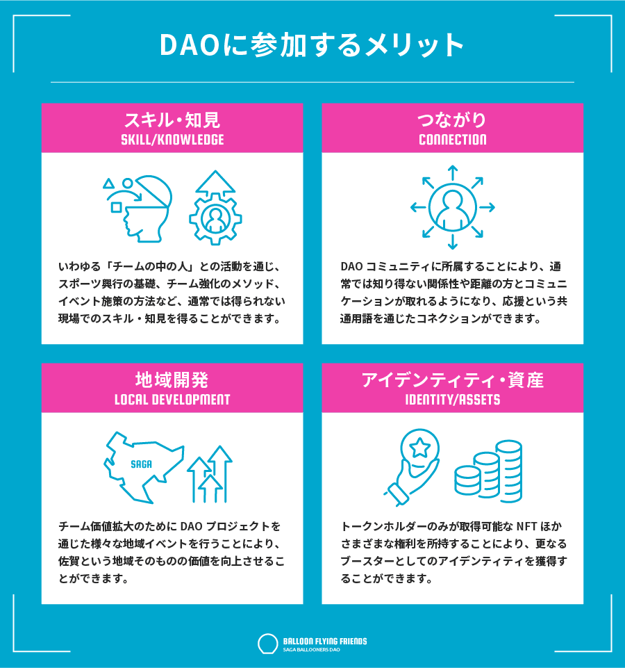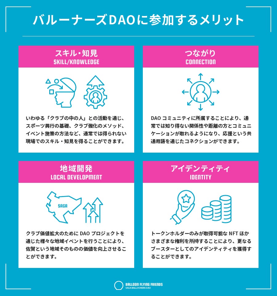 ブースターとしての関わりはもちろんのこと、DAOメンバーとしてより強い関わりを持って『佐賀バルーナーズ』を、また『佐賀県』を盛り上げたいとご賛同いただける方のご加入を心よりお待ちしております。