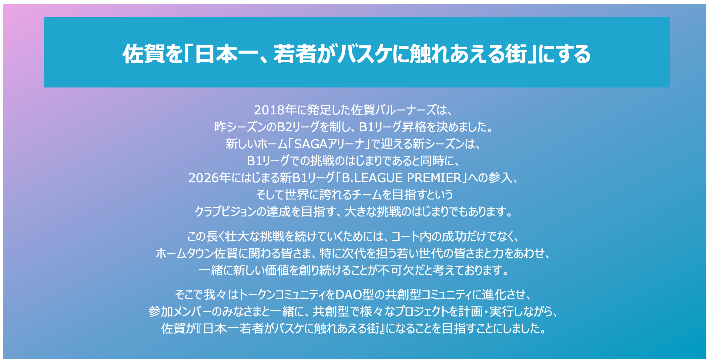 そこで我々はトークンコミュニティをDAO型の共創型コミュニティに進化させ、参加メンバーのみなさまと一緒に、共創型で様々なプロジェクトを計画・実行しながら、佐賀が『日本一若者がバスケに触れあえる街』になることを目指すことにしました。