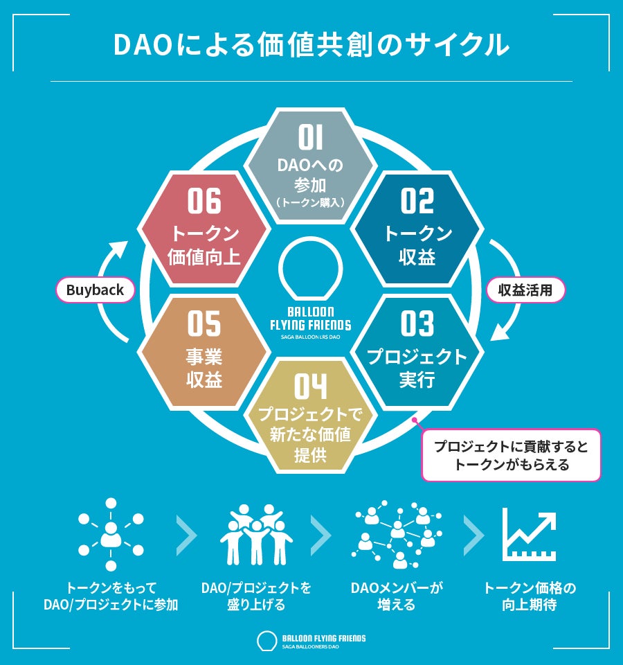 DAOはトークンの販売収益をもとに様々なプロジェクトを実行し、プロジェクトを通して、新たな体験価値やリワードをサポーターの皆様へ還元していきます。またプロジェクトで得た収益の一部でBuy back(自社トークン買い)を行い、トークンの価値向上を狙います。このサイクルにより、DAOは継続的な成長を目指し、DAOに参加するトークンホルダーとWin-Winの関係を築いていきます。
