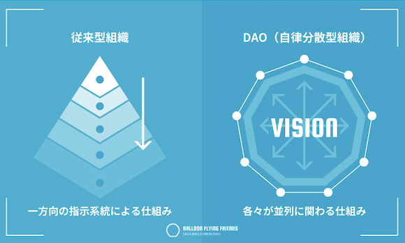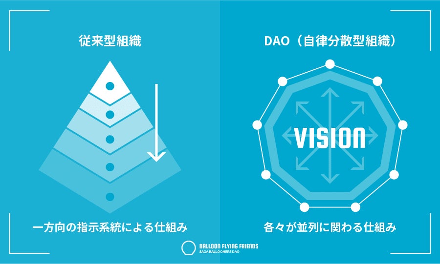 DAOはビジョンに賛同した対等なメンバーにより形成された組織です。ひとつの目的に向かって皆で企画を考え、意思決定を行い、そして行動することにより新しいプロジェクトを推進していきます。共に夢を追い、心を一つに、それぞれの個性が輝く場所。それが私たちが目指すDAOです。