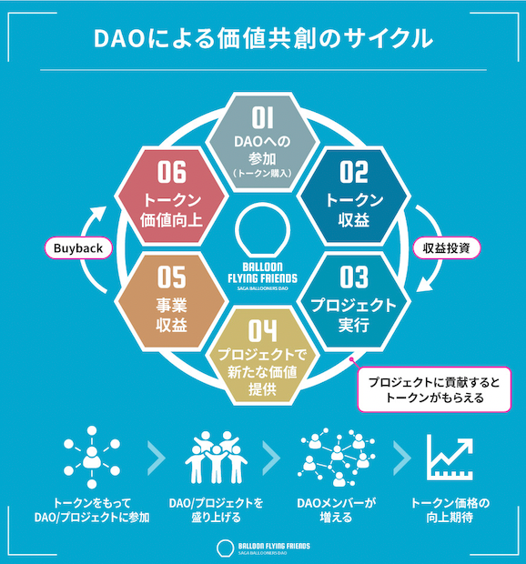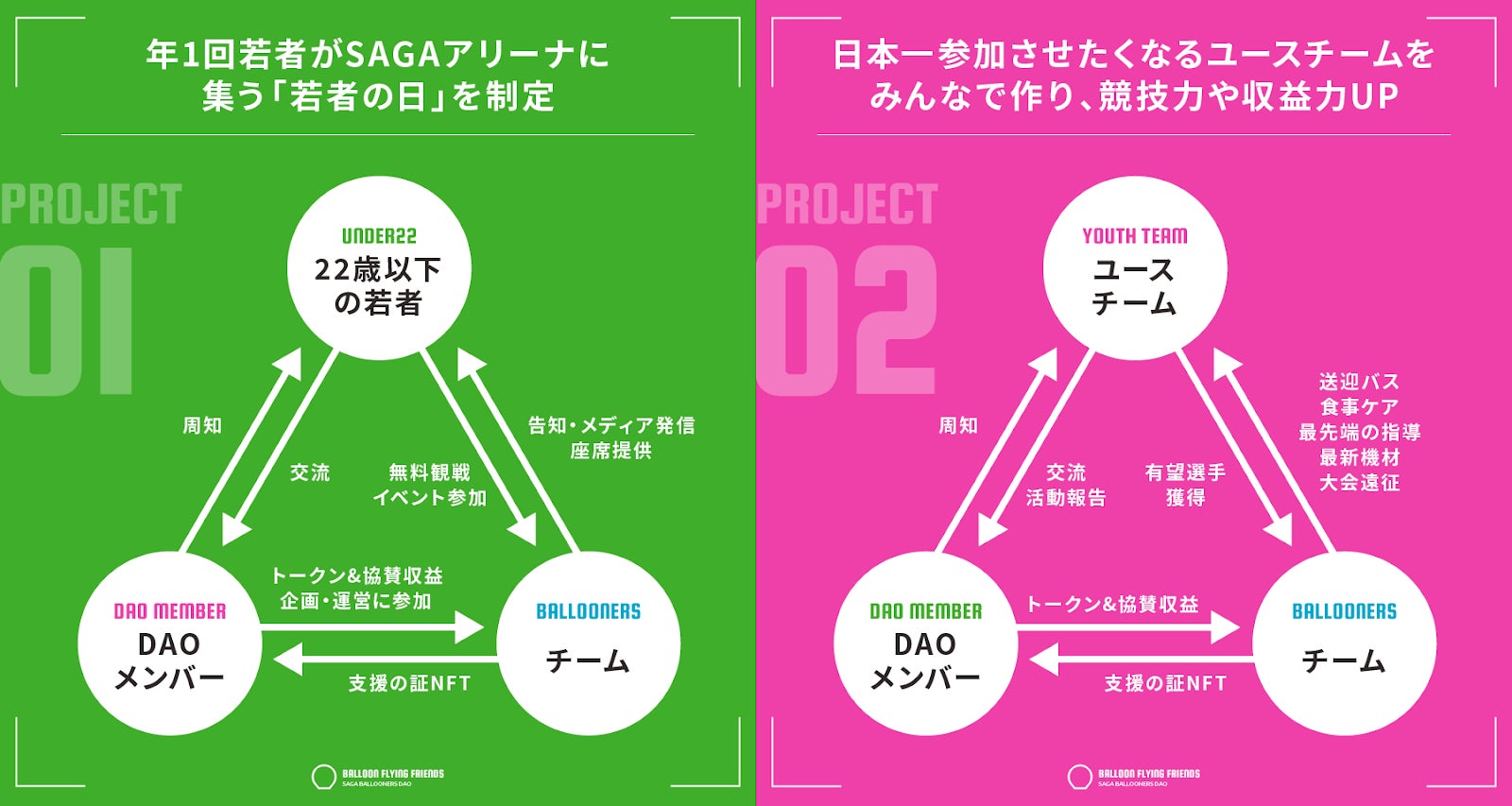 バルーナーズトークンコミュニティは佐賀バルーナーズDAO「BALLOON FLYING FRIENDS」と名称をリニューアルし、Bリーグ所属クラブ初のDAOとして生まれ変わります。それに伴い、実施するプロジェクトの範囲を広げ、トークンホルダーの皆さまにも今まで以上に佐賀バルーナーズの運営やクラブが実施する企画の意思決定に参加していただきたいと考えております。