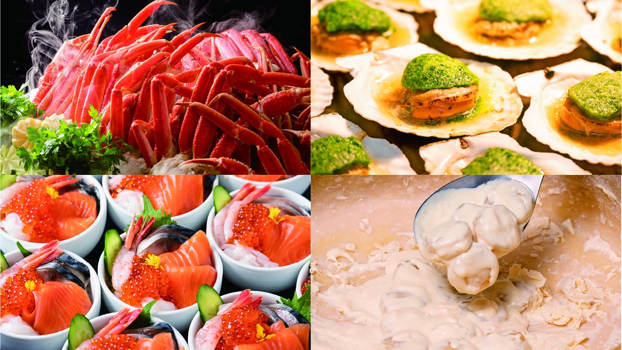 ・蒸し蟹 お好みのフレーバーで ・北海道産ホタテ殻付き鉄板焼き ・北海道“パンかま風”フィッシュロール