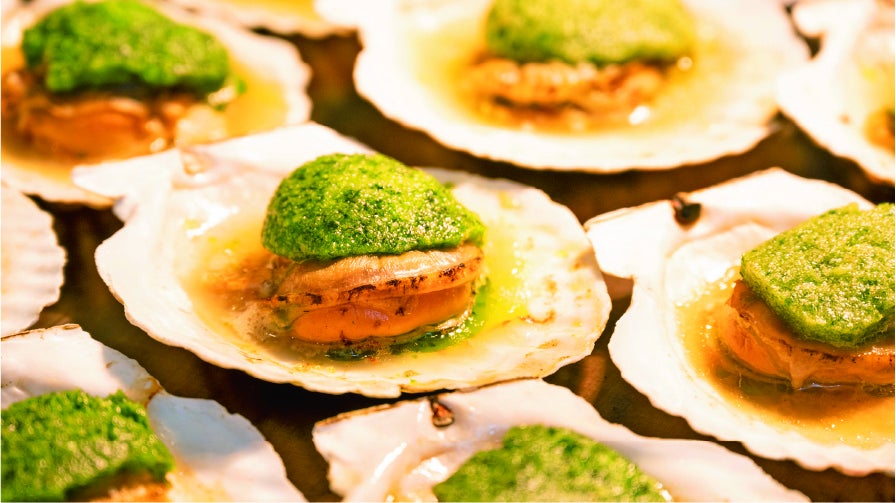 期間を通してお召し上がりいただけるパフォーマンス料理は全6品で、中でも磯の香りが食欲をそそる「北海道産ホタテ殻付き鉄板焼き」のプリップリの食感が絶品です。また、とろりと溶けた「十勝産ラクレット」は茹でたじゃがいもやパンに絡めるのがおすすめです。「北海風海鮮丼鉢」や定番の「ローストビーフ」のほか、お客様からのご要望が多い「蒸し蟹」や某ゲームでも話題の「いももち」をパルミジャーノレッジャーノで和えた料理など、心ゆくまでお召し上がりください。上記以外のメニューの一部は5月16日(月)から変更になるため、来店時期により異なるメニューがお楽しみいただけます。