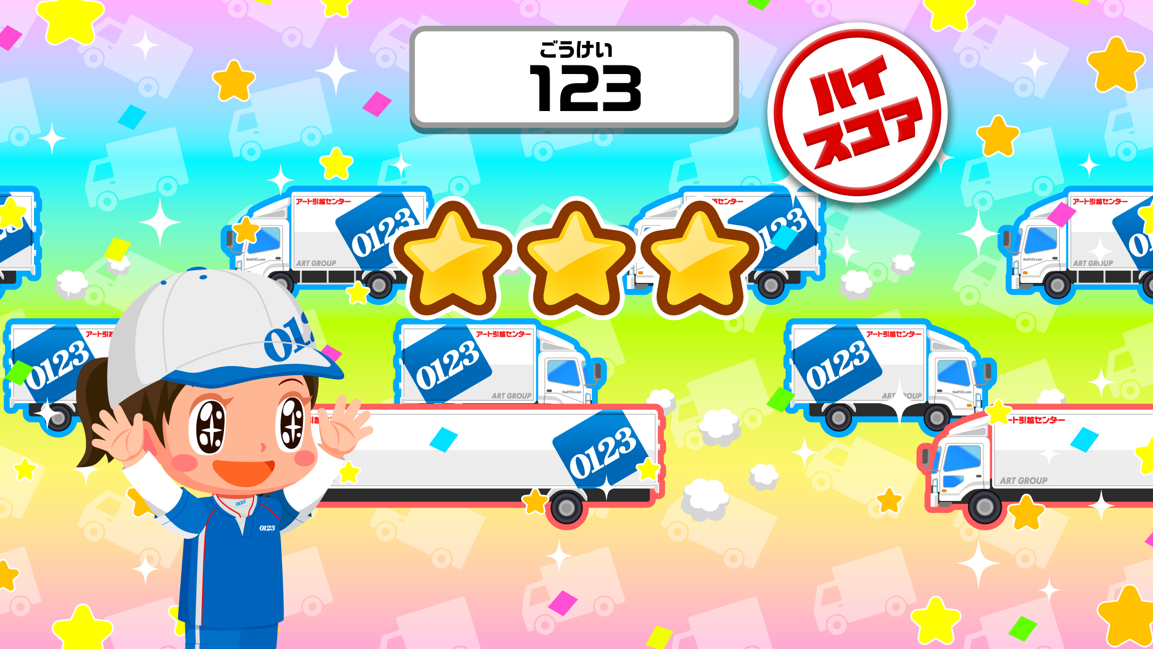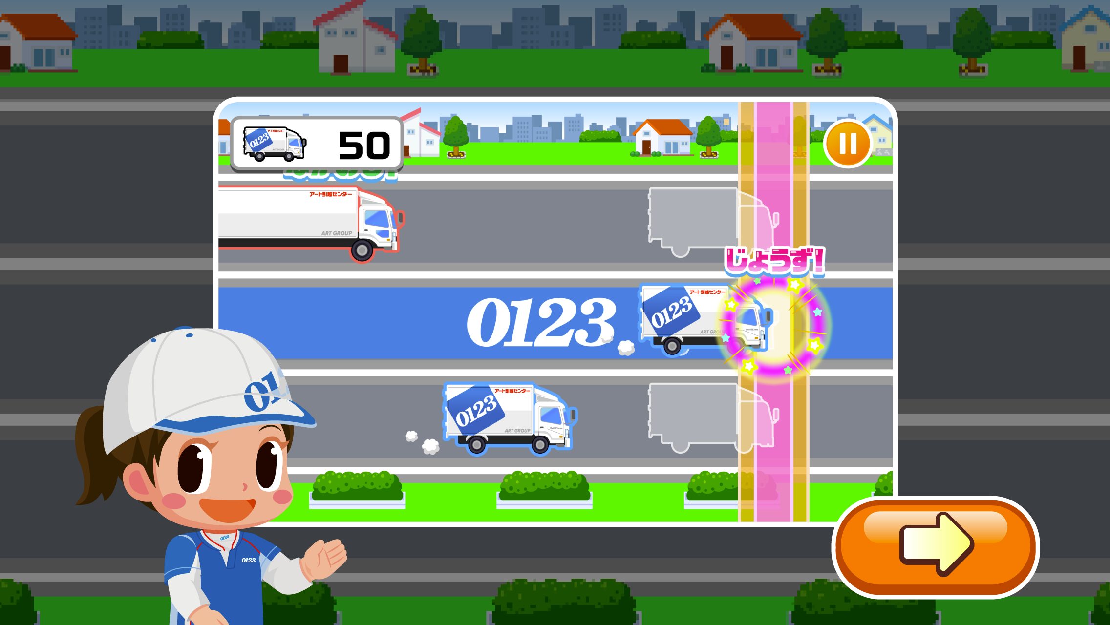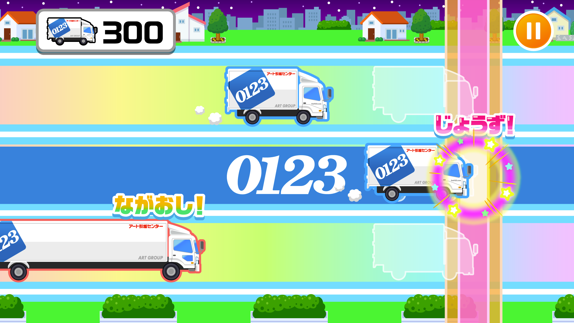 引越しの荷物を運ぶトラックを、アート引越センターのCMソングに合わせて走らせる音楽ゲームです。道路を走るトラックが赤いラインを通過するタイミングに合わせてタップします。長いトラックの場合は、ラインを通過する間、長押しをします。タイミングよく行うことでハイスコアを目指します。