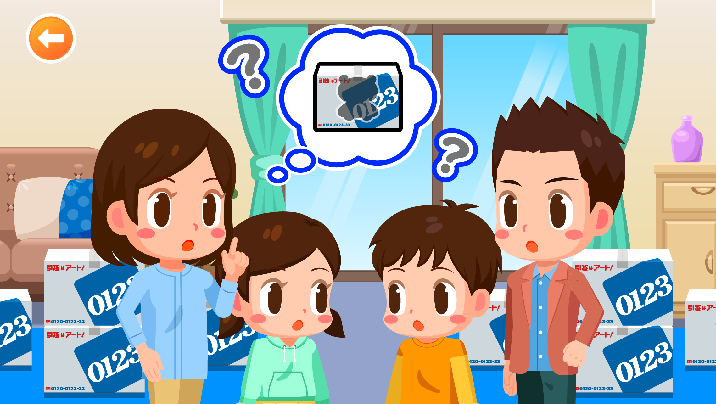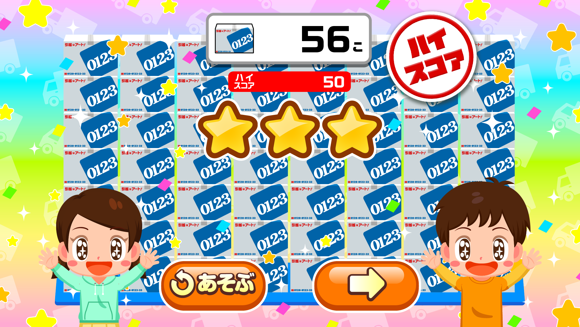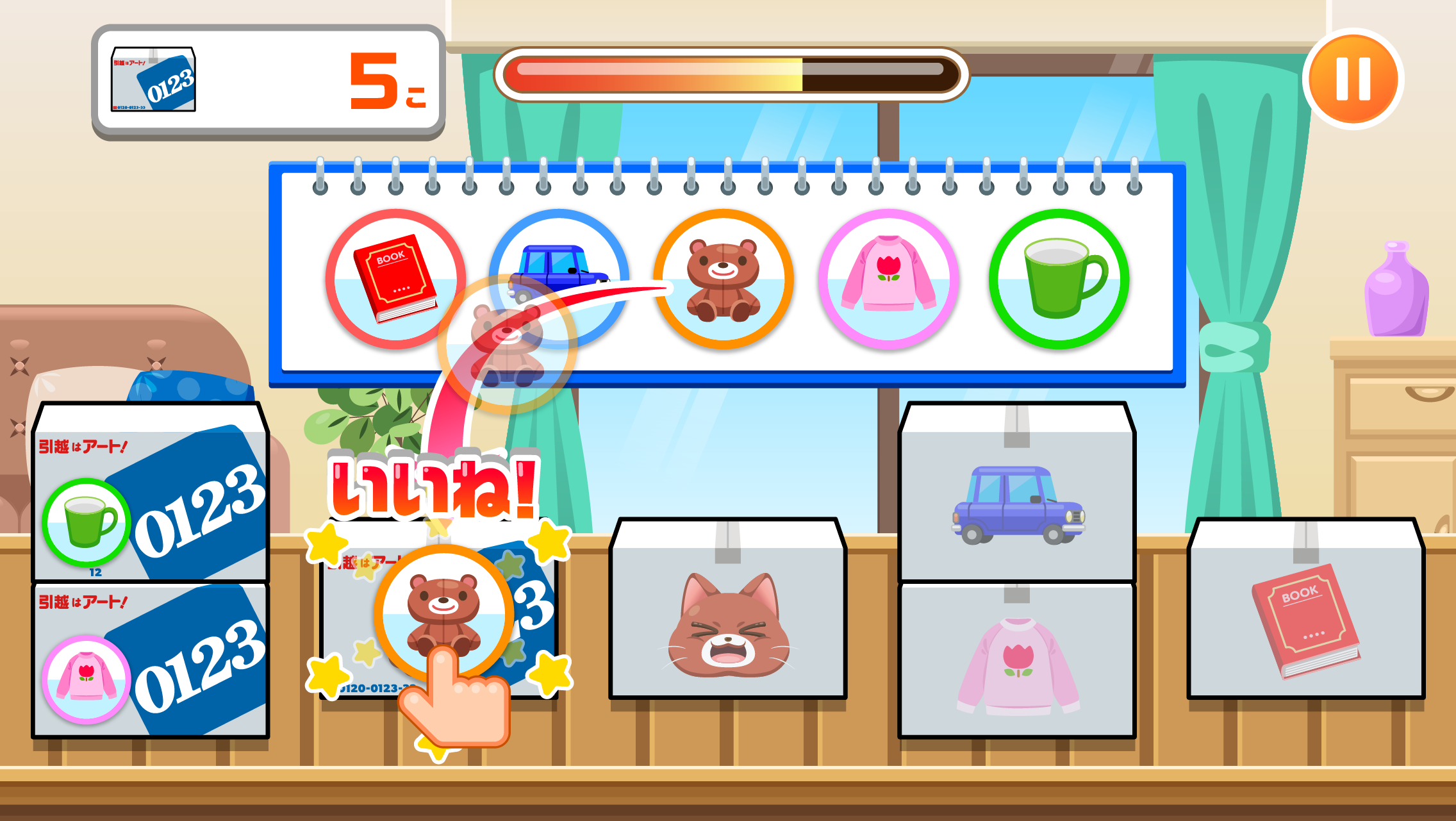 箱の中身と同じ絵のシールを貼ることで、箱に何が入っているかを分かるようにする引越しお手伝いゲームです。シールを貼ってはいけない「お邪魔ダンボール」も登場するので、注意しながら、時間内により多くのシールを貼ることを目指します。