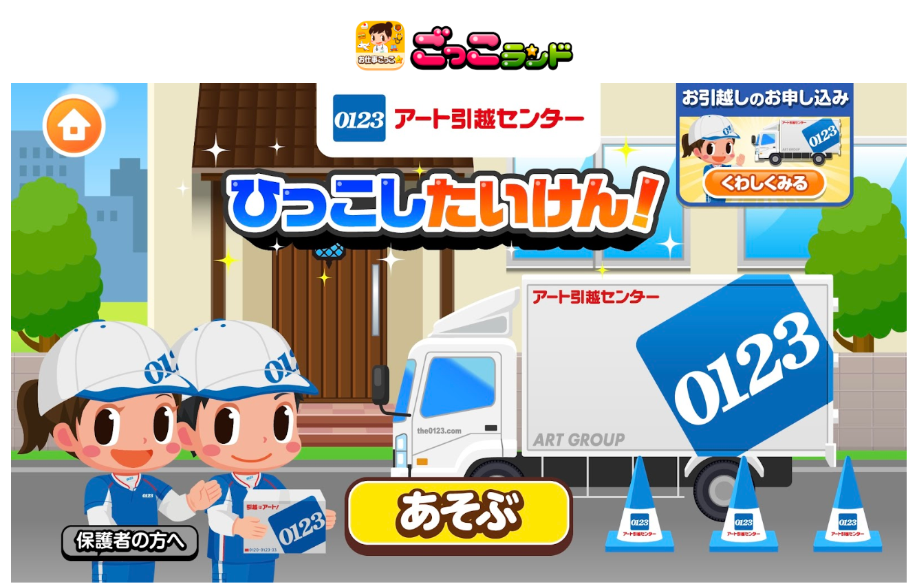 本ゲームを協賛するアート引越センターは、国内で初めて「引越し」を専業とする会社として誕生し、引越しを「運送業」ではなく「サービス業」として発展させてきました。子どもたちに楽しみながら、引越しサービスを身近に感じてもらいたいという想いから、『ごっこランド』への出店が実現しました。