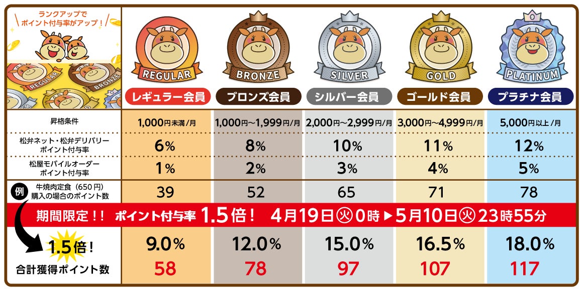 このたび松屋フーズ(本社:東京都武蔵野市、代表取締役社長:瓦葺一利)では、牛めし・カレー・定食・その他丼の「松屋」をはじめとする松屋フーズ全店(松弁ネット実施店舗)におきまして、お弁当WEB予約サイト“松弁ネット”にて導入いたしております松弁ポイントの「50%増量キャンペーン」を4月19日(火)~5月10日(火)までの期間限定で開催いたします。