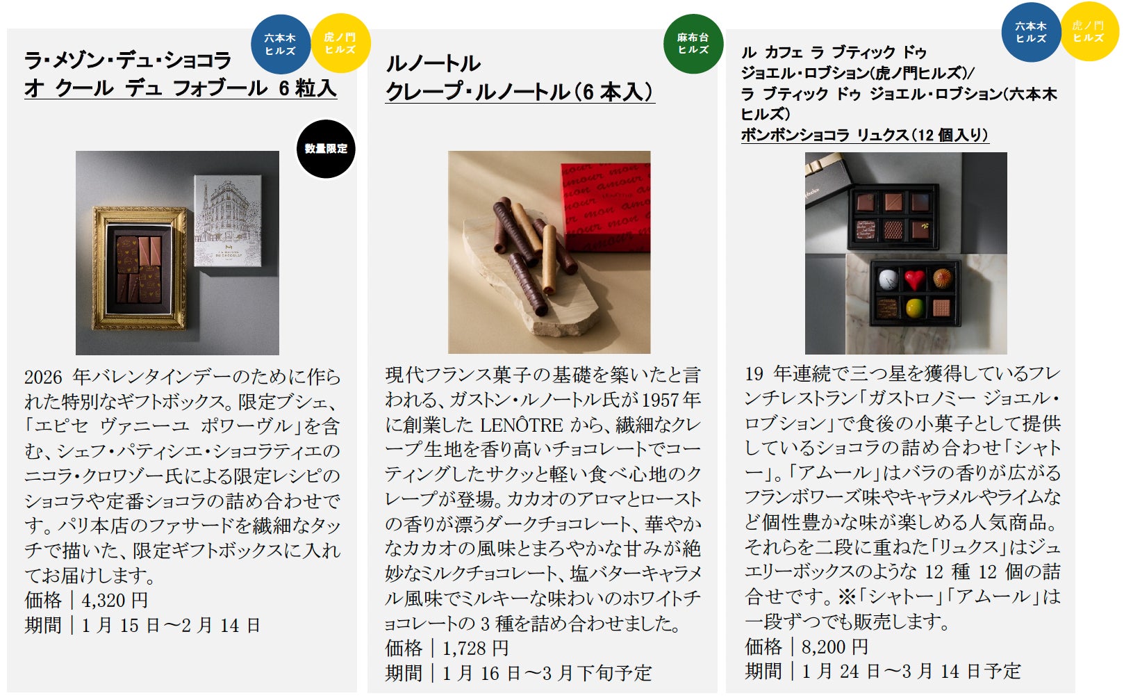 「HILLS SWEETS SELECTION 2026」は、名店のシェフやパティシエが腕を振るう至高のチョコレート&スイーツに加え、果実を贅沢に使った華やかなスイーツや、定番の焼き菓子やマカロンなど、大切な人への感謝を込めたギフトにも、自分へのご褒美スイーツにも、ぴったりな商品をお選びいただけます。